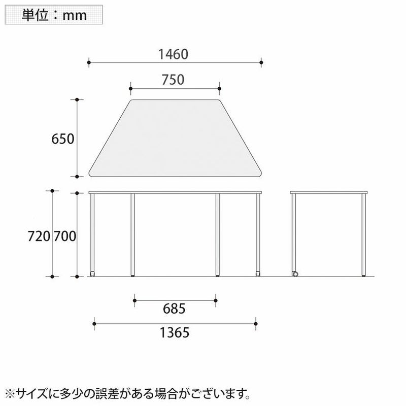 | ご注意 | ※クッションフロアー上ではご使用にならないでください。 床を傷つける場合があります。 ※片側キャスター仕様のため、テーブル移動時はアジャスター脚側の天板を持ち上げて動かしてください。 ※キャスターにストッパー機能はありません。 商品特性上、テーブルの揺れや動きやすさを感じる場合があります。 ※天板表面は塗装仕上げのため、メラミン天板と比べると ご使用状況によっては傷や光沢の変化が目立つ場合があります。 ※暗い色の天板は使用状況や光の状況により、指紋等の汚れが目立つ場合があります。 |