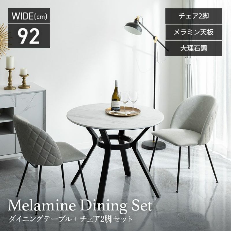 ●360°好きな位置に座れる丸テーブルはチェアを置く位置が固定されないので、限られたスペースでも置きやすい点が魅力です。●メラミナイト天板メラミンを高密度の繊維板に特殊工法で圧着させた、通常のメラミンよりも硬く、セラミックよりも軽い素材です。●メラミナイトの特徴 耐水性温湿度変化による収縮・膨張が少なく、高い寸法安定性を保持。水滴が染みこみません。●メラミナイトの特徴 耐汚性洗剤やコーヒーなどを1時間放置しても移染変化はありません。アルコール除菌も◎●メラミナイトの特徴 耐熱性180℃までの温度では変形、隆起、ひび割れなどの変化はありません。●メラミナイトの特徴 耐衝撃性強い力や衝撃を与えても目に見える損傷は見られません。●メラミナイトの特徴 耐摩耗性まな板の使用や陶器の食器類を引きずっても大丈夫です。●メラミナイトの特徴 耐紫外線色褪せにくく、長期にわたってお使いいただけます。●メラミナイトの特徴耐剥離性天板全体を圧着溶着する製造工程のため、一般的なメラミンテーブルと比べて耐剥離性に優れています。●メラミナイトの特徴 高密度通常の繊維版より内部密度が高いです。●二層構造の天板天板は高圧化粧繊維板とラバーウッド無垢材を張り合わせた二層構造になっています。●強度もデザイン性も抜群個性的な4本脚はスタイリッシュな印象を与えつつ、通常の2本脚よりも強度が高い設計となっています。●ガタつき防止のアジャスターテーブルの脚裏には床とのガタつきを防止するアジャスターが付いています。