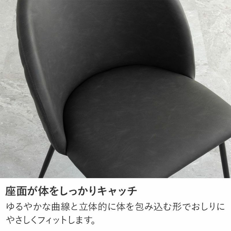 ●座面が体をしっかりキャッチゆるやかな曲線と立体的に体を包み込む形でおしりにやさしくフィットします。●アクセントのキルティング背もたれのキルティングが上品でおしゃれなアクセントに。お部屋に高級感を演出してくれます。●適度なクッション性座面は適度なクッション性で長時間のくつろぎも快適に過ごせます。●お手入れ簡単張地はEPUレザーなので汚れてもサッと拭き取るだけでお手入れが簡単です。●スタイリッシュなスチール脚脚部はしっかり強度のあるスチール脚を使用。外に向かって広くなるデザインなので安定感があります。●ガタつき防止のアジャスターチェアの脚裏には床とのガタつきを防止するアジャスターが付いています。