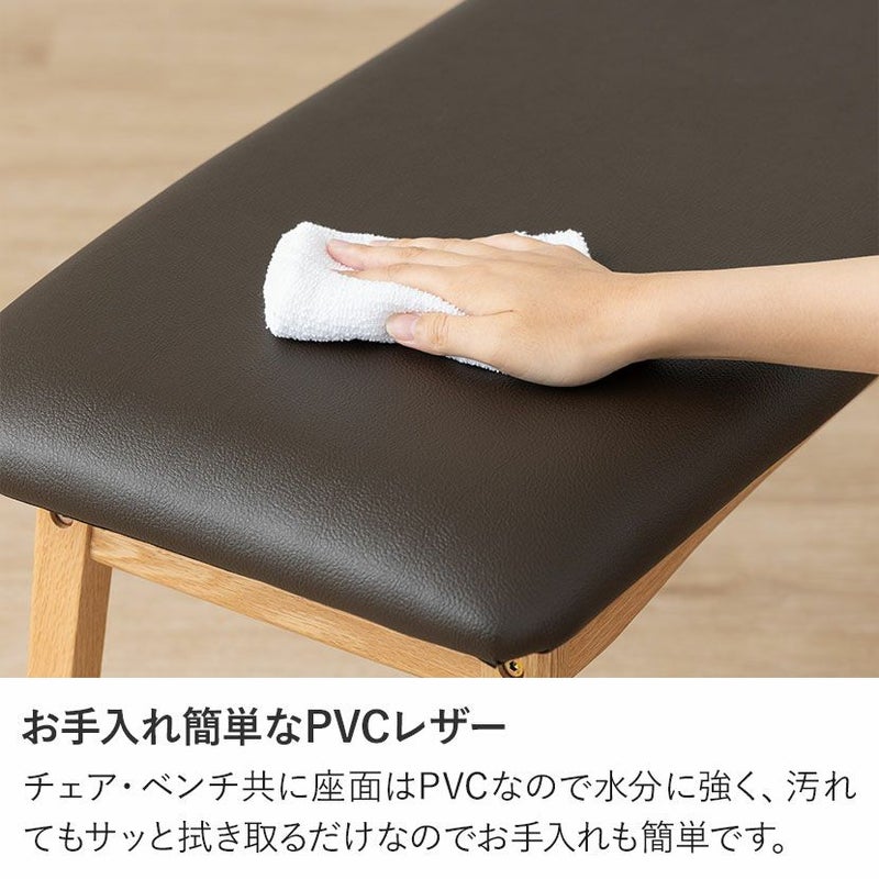高級感溢れる天然木ダイニングセット滑らかであたたかみのある天然木ダイニング。優しい手触りが日々の暮らしの中心になる1台です。●オーク天然木を使用した美しい天板節や白太など、木本来の表情を活かしているので、この世にひとつとして同じものは存在しません。●木の質感を損なわないウレタン塗装人体に有害なトルエン・キシレンが発生しない安心な塗料を使用しているため、安心してお使いいただけます。●反り防止板天板の反りを防ぐために、天板裏には反り止め板を取り付けています。●優しく滑らかな角の処理天板のフチは角が出ないように加工を施し、優しい手触りに仕上げています。●天板をしっかり支える4本脚脚は天板のフォルムに合う丸みを持たせ、安定感のあるハの字脚構造になっています。●ガタつき防止のアジャスター床面との調節ができ、多少凹凸のある場所でも水平に設置できます。●天然木によるナチュラル感とあたたかみウォールナットの背もたれとオークのフレームを組み合わせたツートン仕様のダイニングチェアです。●持ち運びが簡単な軽量チェア軽量なので女性やお子様でも簡単に持ち上げられ、お掃除も楽に行えます。●背中に沿う絶妙な曲線背もたれは木に直接カーブをつけ、どこから見ても美しいデザインに仕上げています。●ツートンカラーウォールナット材とオーク材を組み合わせたデザインはモダンでおしゃれな空間を演出します。●体を支える背もたれ背もたれは絶妙な傾斜により、無理なく体を支えてくれるので、ゆったりと体を預けることができます。●適度な弾力の座り心地チェアとベンチの座面は適度な弾力のある座り心地で、座面の幅が広めなのでゆったり座ることができます。●お手入れ簡単なPVCレザーチェアとベンチの座面はPVCなので水分に強く、汚れてもサッと拭き取るだけなのでお手入れも簡単です。●使い勝手のいいシンプルなベンチ背もたれのないデザインは圧迫感がなく、コンパクトなスペースにもおすすめです。