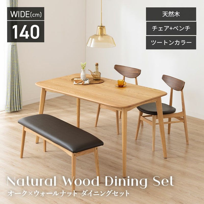 【設置無料】4人用 木製 ダイニングテーブルセット 4点 ビーグル オーク 無垢 テーブル 天然木 肘なし ダイニングチェア 合皮 ダイニングベンチ おしゃれ 北欧 (幅140cm 食卓テーブル×1 食卓椅子×2 ベンチ×1)