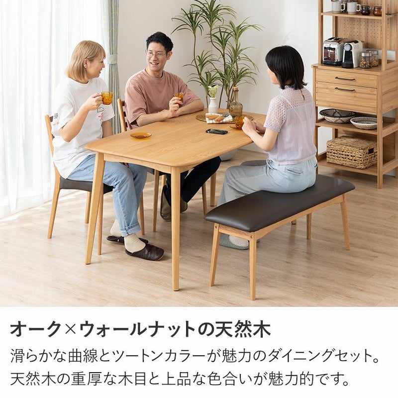 高級感溢れる天然木ダイニングセット滑らかであたたかみのある天然木ダイニング。優しい手触りが日々の暮らしの中心になる1台です。●オーク天然木を使用した美しい天板節や白太など、木本来の表情を活かしているので、この世にひとつとして同じものは存在しません。●木の質感を損なわないウレタン塗装人体に有害なトルエン・キシレンが発生しない安心な塗料を使用しているため、安心してお使いいただけます。●反り防止板天板の反りを防ぐために、天板裏には反り止め板を取り付けています。●優しく滑らかな角の処理天板のフチは角が出ないように加工を施し、優しい手触りに仕上げています。●天板をしっかり支える4本脚脚は天板のフォルムに合う丸みを持たせ、安定感のあるハの字脚構造になっています。●ガタつき防止のアジャスター床面との調節ができ、多少凹凸のある場所でも水平に設置できます。●天然木によるナチュラル感とあたたかみウォールナットの背もたれとオークのフレームを組み合わせたツートン仕様のダイニングチェアです。●持ち運びが簡単な軽量チェア軽量なので女性やお子様でも簡単に持ち上げられ、お掃除も楽に行えます。●背中に沿う絶妙な曲線背もたれは木に直接カーブをつけ、どこから見ても美しいデザインに仕上げています。●ツートンカラーウォールナット材とオーク材を組み合わせたデザインはモダンでおしゃれな空間を演出します。●体を支える背もたれ背もたれは絶妙な傾斜により、無理なく体を支えてくれるので、ゆったりと体を預けることができます。●適度な弾力の座り心地チェアとベンチの座面は適度な弾力のある座り心地で、座面の幅が広めなのでゆったり座ることができます。●お手入れ簡単なPVCレザーチェアとベンチの座面はPVCなので水分に強く、汚れてもサッと拭き取るだけなのでお手入れも簡単です。●使い勝手のいいシンプルなベンチ背もたれのないデザインは圧迫感がなく、コンパクトなスペースにもおすすめです。