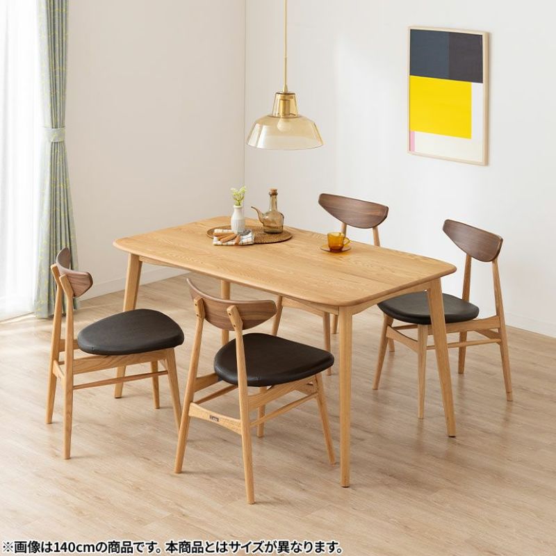 高級感溢れる天然木ダイニングセット滑らかであたたかみのある天然木ダイニング。優しい手触りが日々の暮らしの中心になる1台です。●オーク天然木を使用した美しい天板節や白太など、木本来の表情を活かしているので、この世にひとつとして同じものは存在しません。●木の質感を損なわないウレタン塗装人体に有害なトルエン・キシレンが発生しない安心な塗料を使用しているため、安心してお使いいただけます。●反り防止板天板の反りを防ぐために、天板裏には反り止め板を取り付けています。●優しく滑らかな角の処理天板のフチは角が出ないように加工を施し、優しい手触りに仕上げています。●天板をしっかり支える4本脚脚は天板のフォルムに合う丸みを持たせ、安定感のあるハの字脚構造になっています。●ガタつき防止のアジャスター床面との調節ができ、多少凹凸のある場所でも水平に設置できます。●天然木によるナチュラル感とあたたかみウォールナットの背もたれとオークのフレームを組み合わせたツートン仕様のダイニングチェアです。●唯一無二の模様の表情背もたれは木のあたたかみを感じるウォールナット天然木。水分や汚れに強いウレタン塗装で仕上げています。●背中に沿う絶妙な曲線背もたれは木に直接カーブをつけ、どこから見ても美しいデザインに仕上げています。●ツートンカラーウォールナット材とオーク材を組み合わせたデザインはモダンでおしゃれな空間を演出します。●適度な弾力の座り心地座面は適度な弾力のある座り心地で、座面の幅が広めなのでゆったり座ることができます。●お手入れ簡単なPVCレザー座面はPVCなので水分に強く、汚れてもサッと拭き取るだけなのでお手入れも簡単です。●体重をしっかり支えるハの字脚脚部は丸みを持った滑らかなデザインで安定感のあるハの字構造になっています。