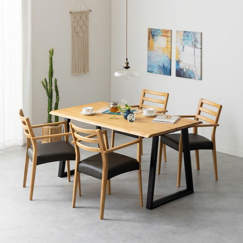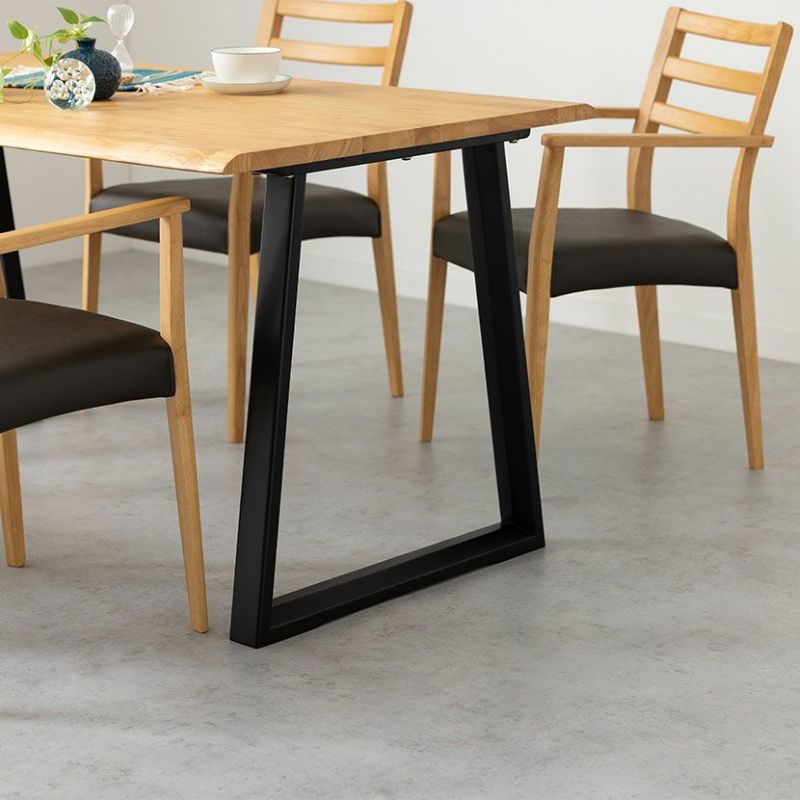 高級感溢れる天然木ダイニングセット滑らかであたたかみのある天然木ダイニング。優しい手触りが日々の暮らしの中心になる1台です。●重厚感のある天然の耳を演出したテーブルサイドの波打った「耳」と呼ばれる部分が、1枚板の風合いを思わせる趣のあるデザインです。●天然木を贅沢に使用したダイニングテーブル節や白太など、木本来の表情を活かしているので、この世にひとつとして同じものは存在しません。●凹凸のある、天然の耳を演出天板長辺にあえて波打つデザインを施し、天然木らしい温かみある風合いを創造しています。●反り防止金具テーブル天板裏面には木材の反り防止のための金具がはめ込んであります。●天板をしっかり支えるロの字脚脚は多角形になっていて、シンプルでオシャレなデザイン。台形に固定されているので、安定感があります。●選べる脚脚は左からブラック、オーク、ウォールナットの3種類。お部屋の雰囲気に合わせてお選びいただけます。●ガタつき防止のアジャスター床面との調節ができ、多少凸凹のある場所でも水平に設置できます。●天然木のあたたかみを感じられるチェア天然木のあたたかみ溢れるルーバーデザインチェア。ブラックの座面がデザイン全体を引き締めます。●持ち運びが簡単な軽量チェア軽量なので女性やお子様でも簡単に持ち上げられ、お掃除も楽に行えます。●軽やかなフォルムデザインチェアのフレームは木のあたたかみを感じる天然木。背面のルーバーデザインが軽やかさをプラスします。●立ち上がりしやすい肘掛け付き肘掛けは主張しすぎない細身のデザインなので、アームチェアでありながらコンパクトなサイズ感です。●背中に沿う絶妙な曲線背もたれは木に直接カーブをつけ、どこから見ても美しいデザインに仕上げています。●適度な弾力の座り心地座面は適度な弾力のある座り心地で、座面の幅が広めなのでゆったり座ることができます。●お手入れ簡単なPVCレザー座面はPVCなので水分に強く、汚れてもサッと拭き取るだけなのでお手入れも簡単です。
