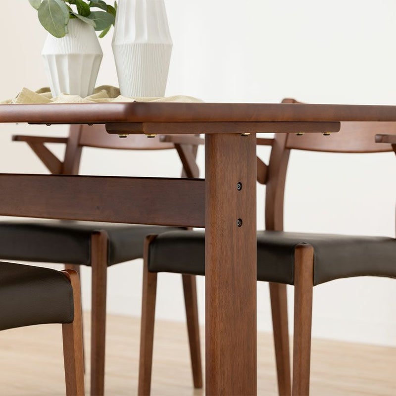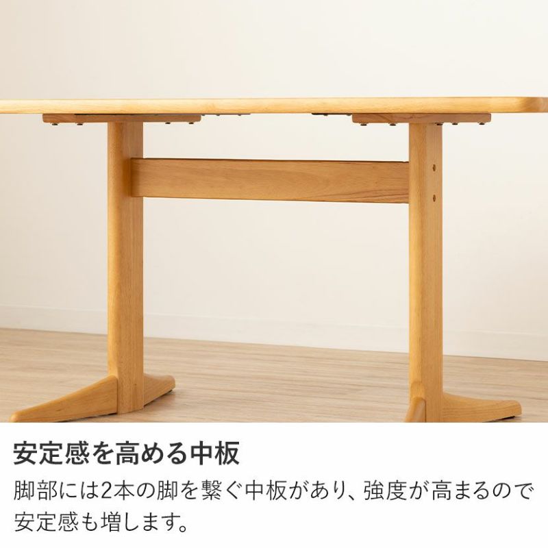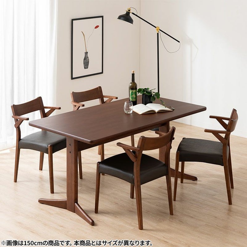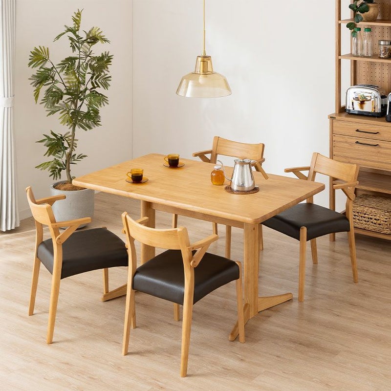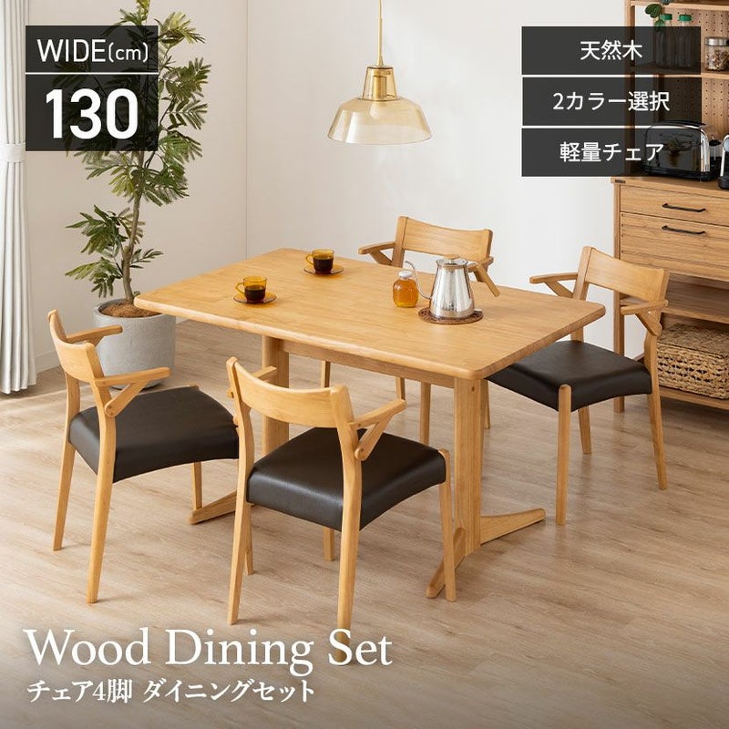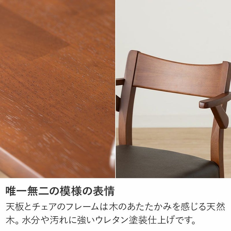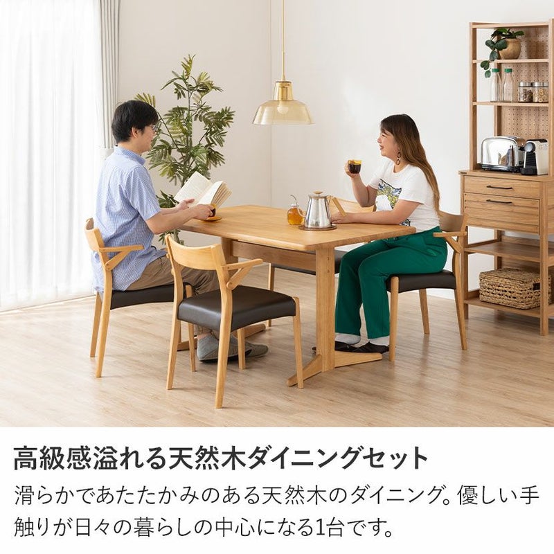 高級感溢れる天然木ダイニングセット滑らかであたたかみのある天然木ダイニング。優しい手触りが日々の暮らしの中心になる1台です。●天然木を贅沢に使用したダイニングテーブル節や白太など、木本来の表情を活かしているので、この世にひとつとして同じものは存在しません。●優しく滑らかな角の処理天板のフチは角が出ないように加工を施し、優しい手触りに仕上げています。●反り防止金具テーブル天板裏面には木材の反り防止のための金具がはめ込んであります。●2本脚で出入りもしやすく2本脚にすることで、すっきりとした見た目に加え、椅子の出し入れや足入れも楽に行えます。安定感を高める中板脚部には2本の脚を繋ぐ中板があり、強度が高まるので安定感も増します。●ガタつき防止のアジャスター床面との調節ができ、多少凸凹のある場所でも水平に設置できます。●天然木のあたたかみを感じられるチェア天然木ならではの高級感が漂い、細身のフレームが美しくスタイリッシュなデザインです。●持ち運びが簡単な軽量チェア軽量なので女性やお子様でも簡単に持ち上げられ、お掃除も楽に行えます。●ローバックタイプ背が低いローバックタイプなので、お部屋に圧迫感を与えにくくなっています。●唯一無二の模様の表情チェアのフレームは木のあたたかみを感じる天然木。水分や汚れに強いウレタン塗装で仕上げています。●背中に沿う絶妙な曲線背もたれは木に直接カーブをつけ、どこから見ても美しいデザインに仕上げています。●肘掛け付き肘掛け部分には立ち座りの際に邪魔になりにくいハーフアームを採用しています。●テーブルに掛けてお掃除簡単肘掛けをテーブルに掛けることができるので、床のお掃除も楽に行えます。●適度な弾力の座り心地座面は適度な弾力のある座り心地で、座面の幅が広めなのでゆったり座ることができます。●お手入れ簡単なPVCレザー座面はPVCなので水分に強く、汚れてもサッと拭き取るだけなのでお手入れも簡単です。