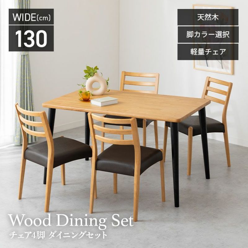 高級感溢れる天然木ダイニングセット滑らかであたたかみのある天然木ダイニング。優しい手触りが日々の暮らしの中心になる1台です。●天然木を贅沢に使用したダイニングテーブル節や白太など、木本来の表情を活かしているので、この世にひとつとして同じものは存在しません。●優しく滑らかな角の処理天板のフチは角が出ないように加工を施し、優しい手触りに仕上げています。●反り防止金具テーブル天板裏面には木材の反り防止のための金具がはめ込んであります。●天板をしっかり支える4本脚脚は天板のフォルムに合う丸みを持たせ、安定感のある?の字脚構造になっています。●選べる脚脚は左からブラック、オーク、ウォールナットの3種類。お部屋の雰囲気に合わせてお選びいただけます。●ガタつき防止のアジャスター床面との調節ができ、多少凸凹のある場所でも水平に設置できます。●天然木のあたたかみを感じられるチェア天然木のあたたかみ溢れるルーバーデザインチェア。ブラックの座面がデザイン全体を引き締めます。●持ち運びが簡単な軽量チェア軽量なので女性やお子様でも簡単に持ち上げられ、お掃除も楽に行えます。●軽やかなフォルムデザインチェアのフレームは木のあたたかみを感じる天然木。背面のルーバーデザインが軽やかさをプラスします。●背中に沿う絶妙な曲線背もたれは木に直接カーブをつけ、どこから見ても美しいデザインに仕上げています。●適度な弾力の座り心地座面は適度な弾力のある座り心地で、座面の幅が広めなのでゆったり座ることができます。●お手入れ簡単なPVCレザー座面はPVCなので水分に強く、汚れてもサッと拭き取るだけなのでお手入れも簡単です。
