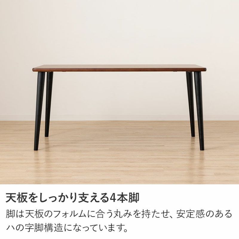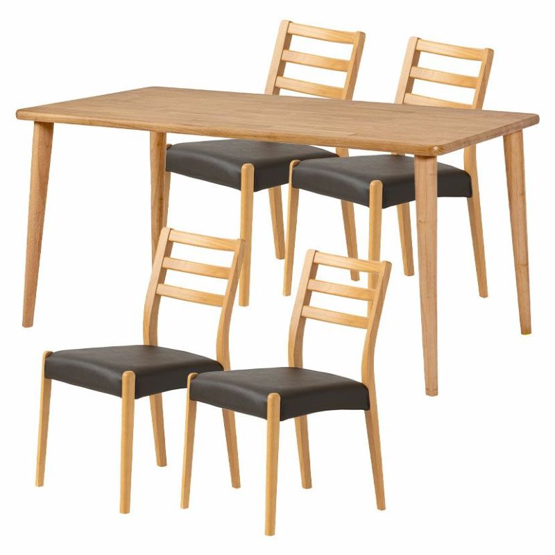 ●シンプルデザインのダイニングテーブル天板は天然木、脚にはブラックカラーも合わせられる、ナチュラルテイストなダイニングテーブルです。●天然木を贅沢に使用したダイニングテーブル節や白太など、木本来の表情を活かしているので、この世にひとつとして同じものは存在しません。●優しく滑らかな角の処理天板のフチは角が出ないように加工を施し、優しい手触りに仕上げています。●反り防止金具テーブル天板裏面には木材の反り防止のための金具がはめ込んであります。●天板をしっかり支える4本脚脚は天板のフォルムに合う丸みを持たせ、安定感のある?の字脚構造になっています。●選べる脚脚は左からブラック、オーク、ウォールナットの3種類。お部屋の雰囲気に合わせてお選びいただけます。●ガタつき防止のアジャスター床面との調節ができ、多少凸凹のある場所でも水平に設置できます。●天然木のあたたかみを感じられるチェア天然木のあたたかみ溢れるルーバーデザインチェア。ブラックの座面がデザイン全体を引き締めます。●持ち運びが簡単な軽量チェア軽量なので女性やお子様でも簡単に持ち上げられ、お掃除も楽に行えます。●軽やかなフォルムデザインチェアのフレームは木のあたたかみを感じる天然木。背面のルーバーデザインが軽やかさをプラスします。●背中に沿う絶妙な曲線背もたれは木に直接カーブをつけ、どこから見ても美しいデザインに仕上げています。●適度な弾力の座り心地座面は適度な弾力のある座り心地で、座面の幅が広めなのでゆったり座ることができます。●お手入れ簡単なPVCレザー座面はPVCなので水分に強く、汚れてもサッと拭き取るだけなのでお手入れも簡単です。