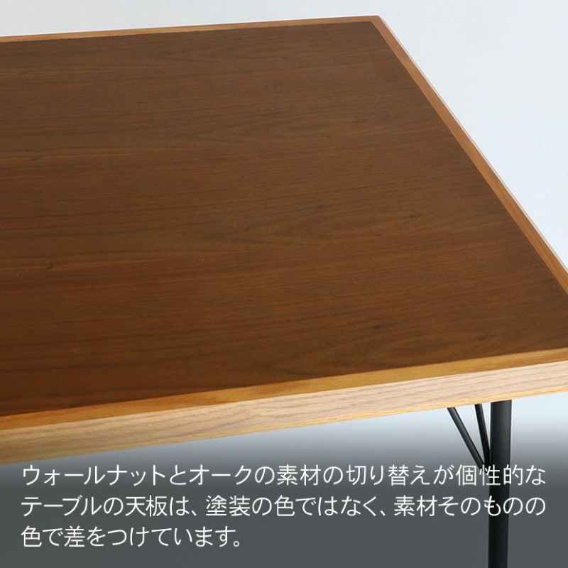中心にウォールナット、縁にオークを使った、アメリカンヴィンテージテイストのダイニングテーブル。
