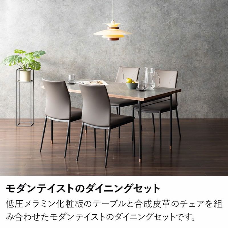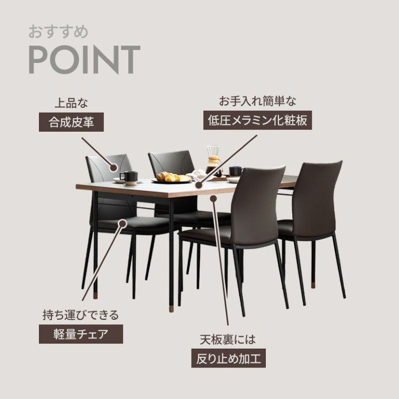 低圧メラミン化粧板のテーブルと合成皮革のチェアを組み合わせたモダンテイストのダイニングセットです。
