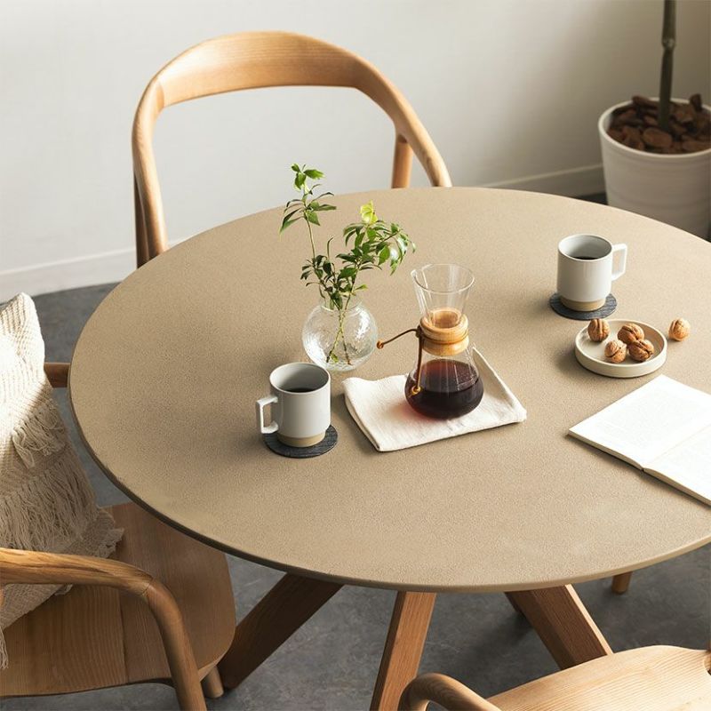 重厚感のあるモルタル天板と、あたたかみのある無垢材を組み合わせた、異素材のダイニングセットです。