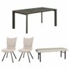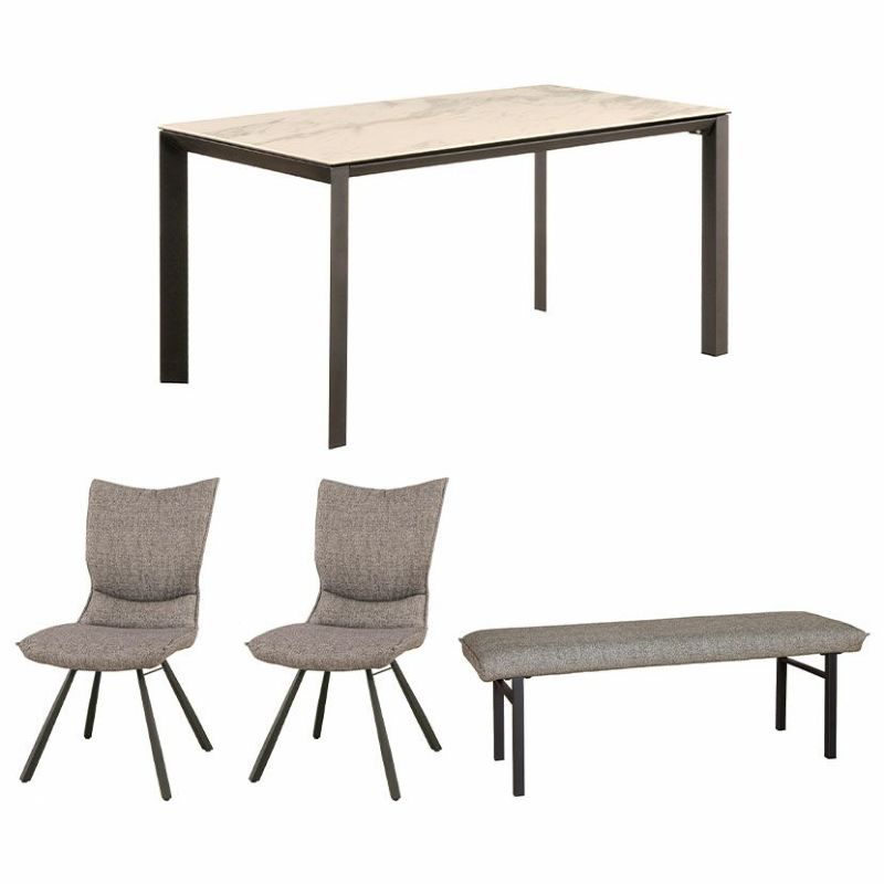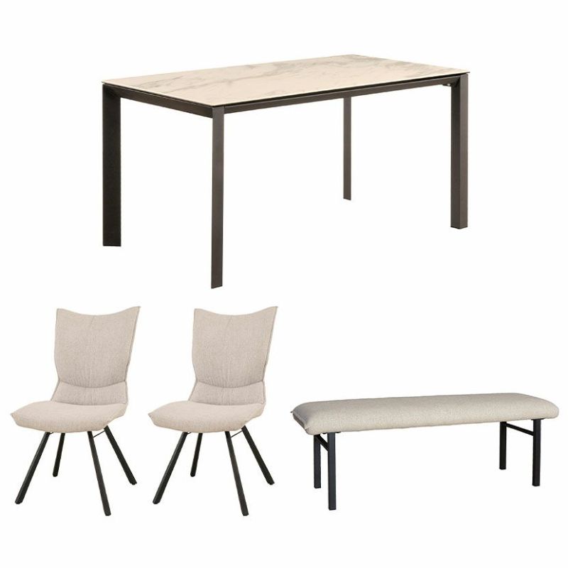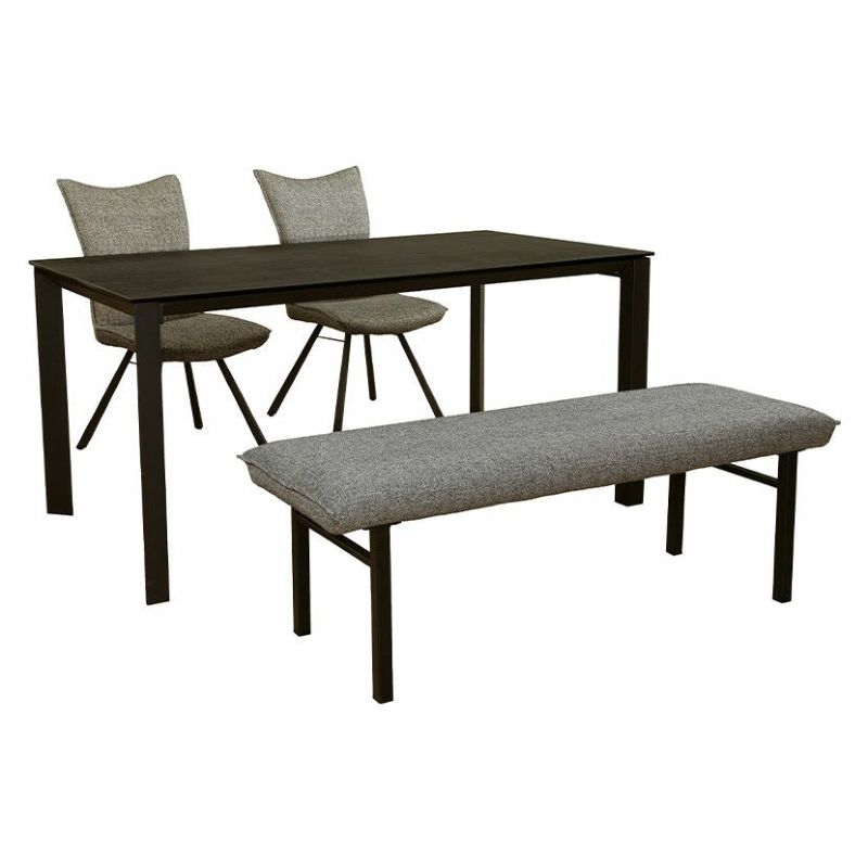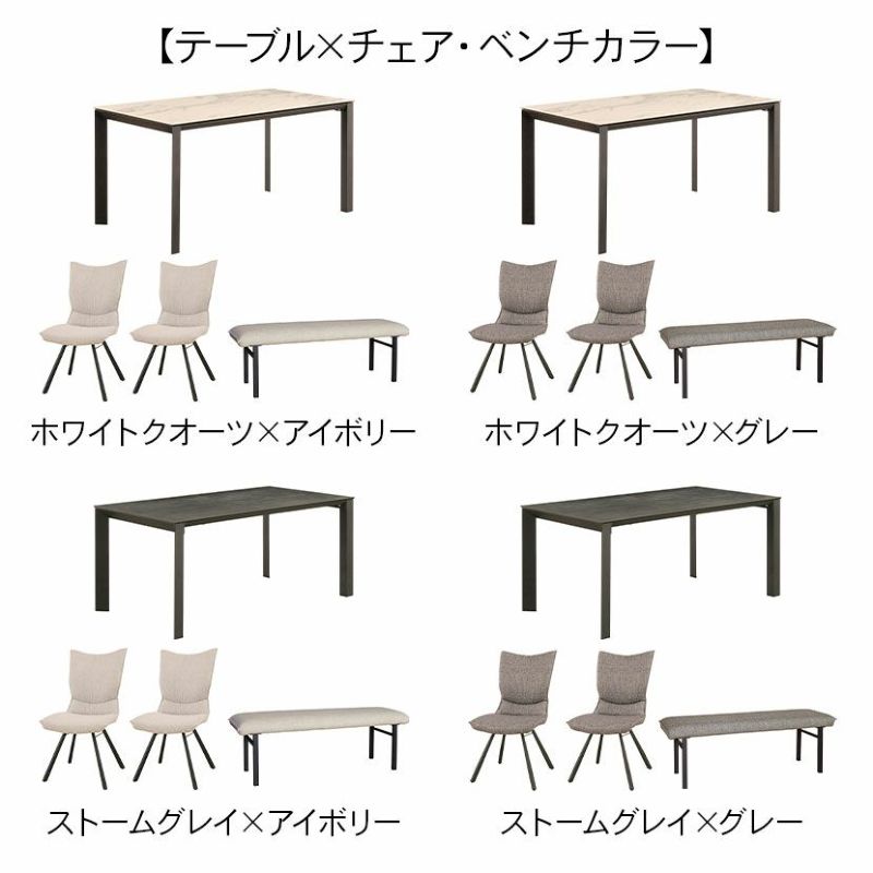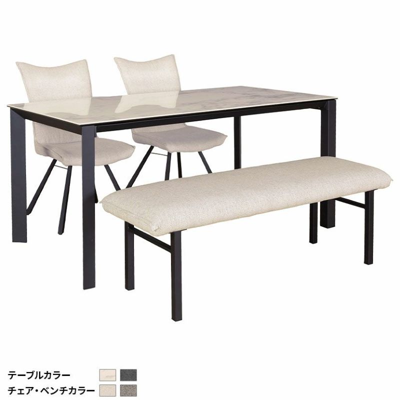 温かみのあるファブリックの張地と、スチール脚との組み合わせが特徴のチェアとベンチ。