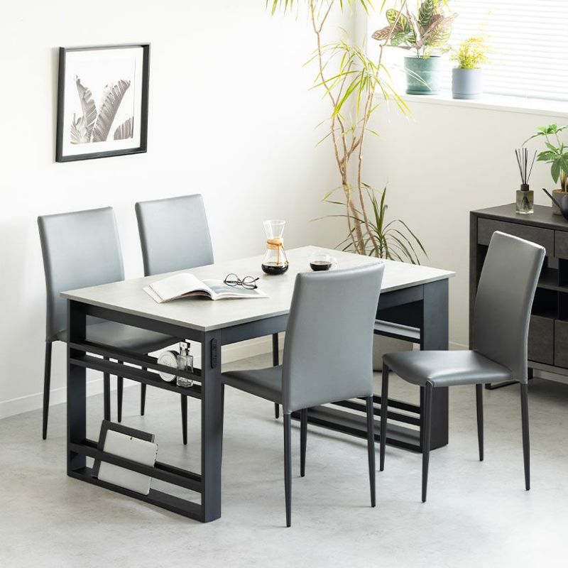 便利な収納棚付きのテーブルとグレーのチェアの組み合わせがモダンなダイニングセットです。