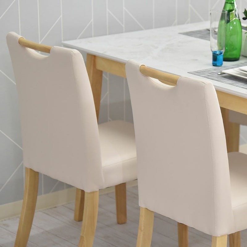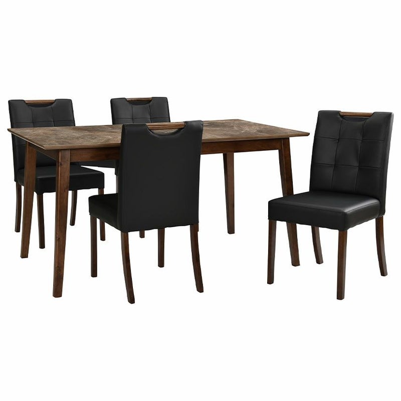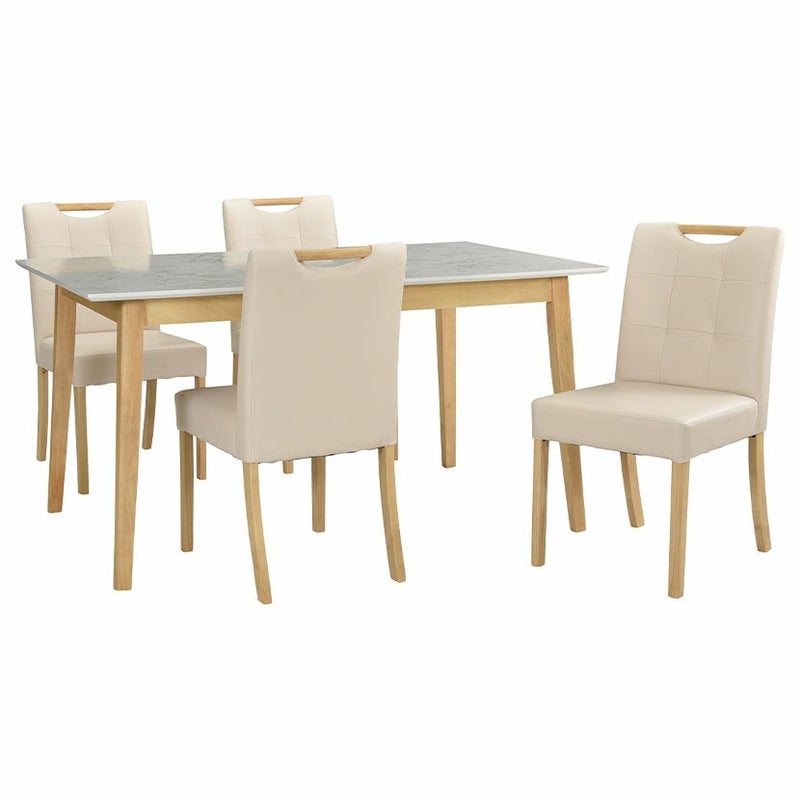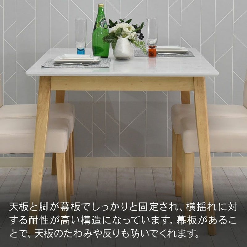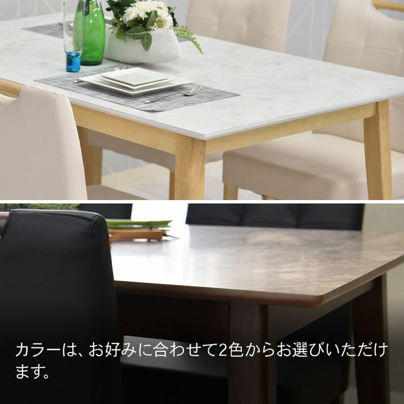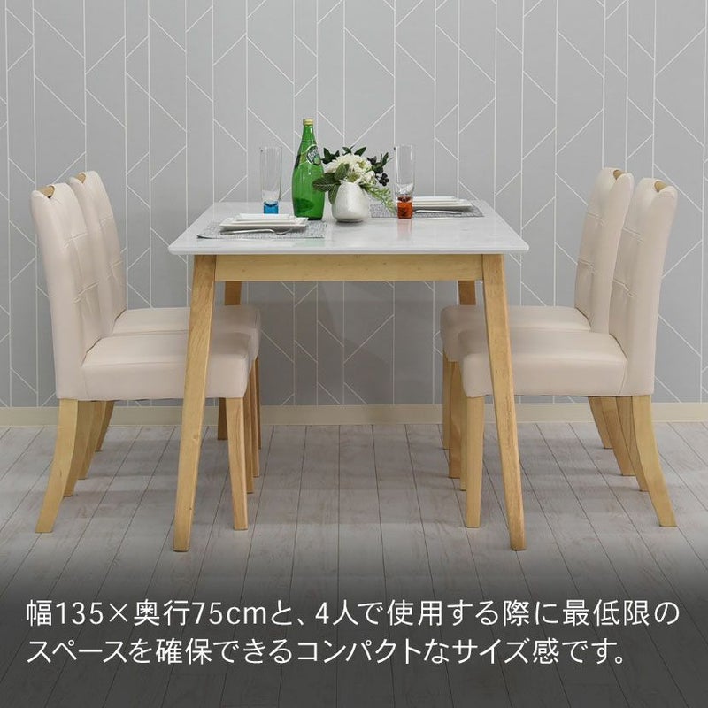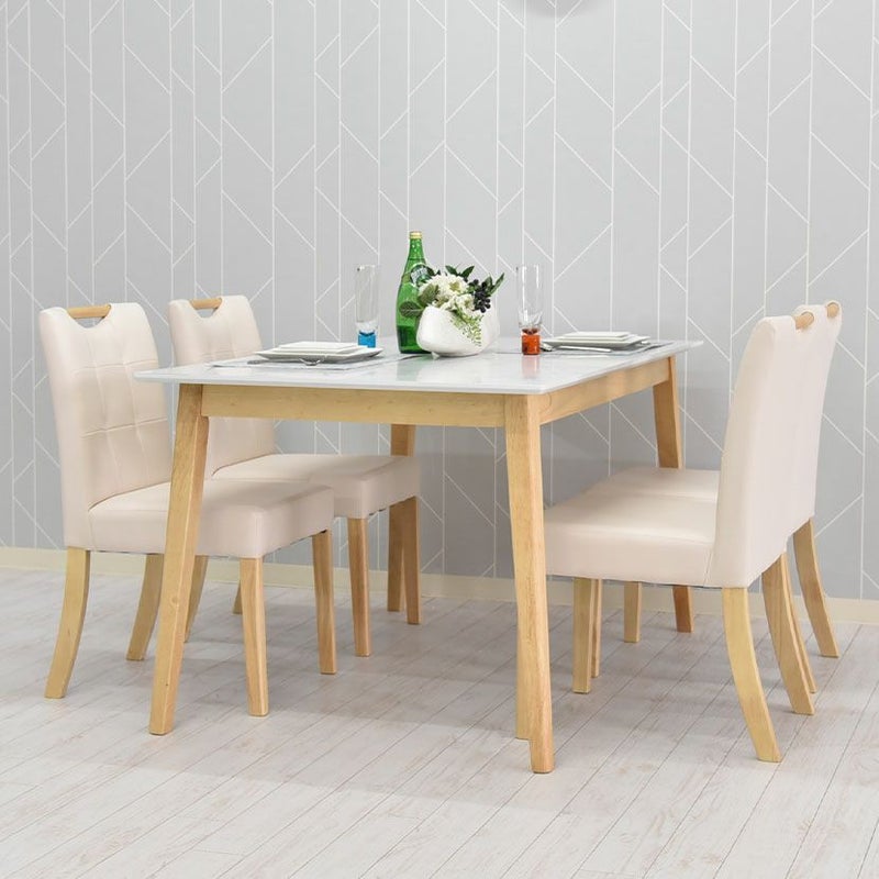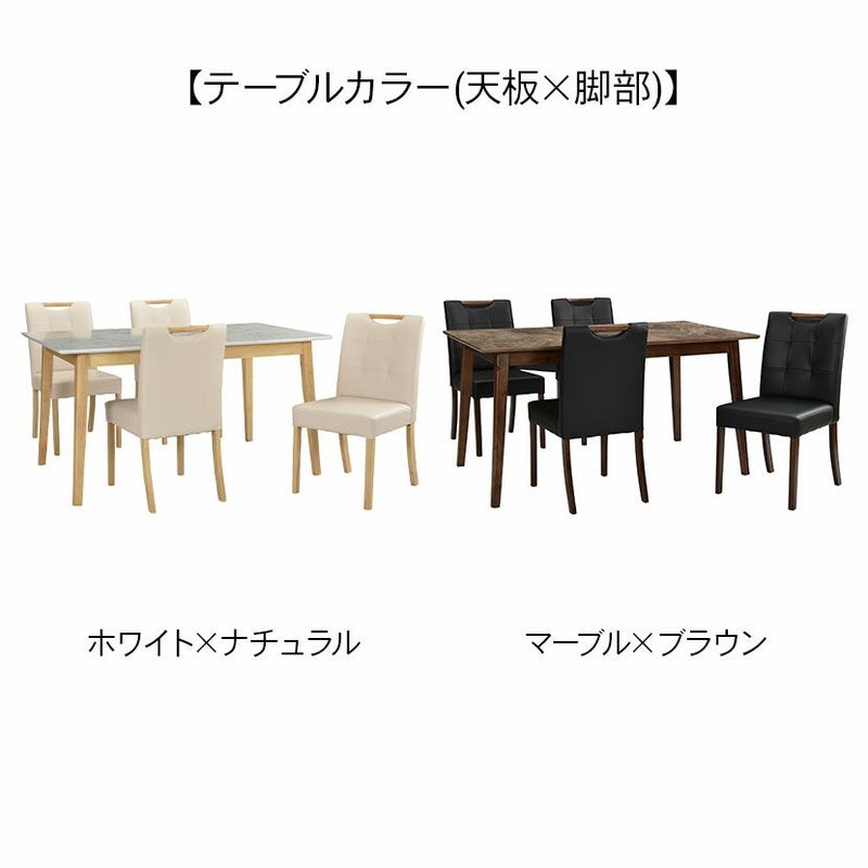 木脚と大理石調の天板を組み合わせた、カジュアルモダンなダイニングテーブルセット。
