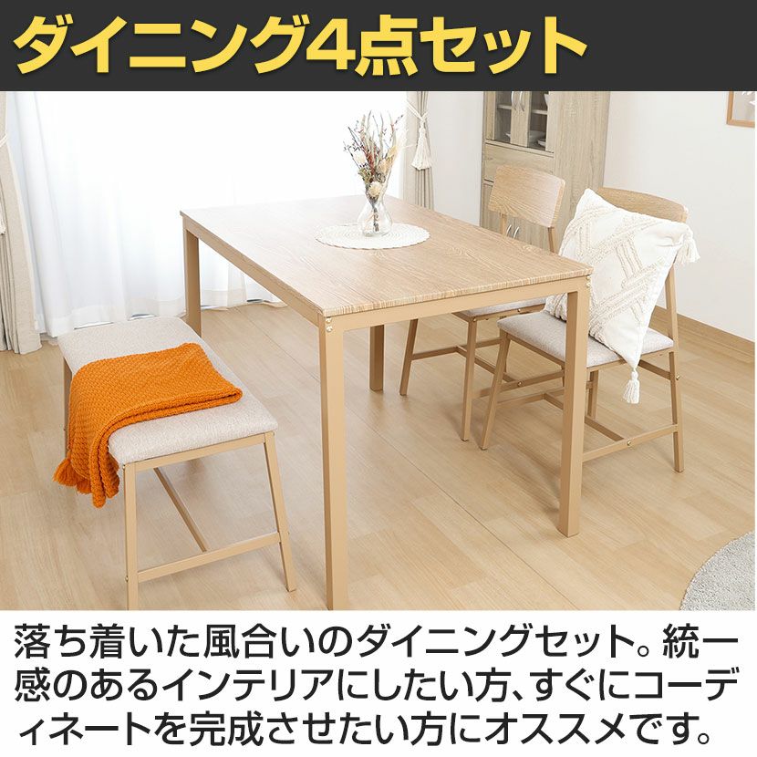 他の画像を見る 4人用 ダイニングセット 4点 テーブル(幅120cm)+チェア2脚+ベンチ ラスティック ダイニングテーブル ダイニングチェア ダイニングベンチ 板座 ナチュラル ヴィンテージ クーポン対象 クーポン対象 送料無料 送料無料 ¥ 77,380 税込 在庫切れ 再入荷お知らせ
