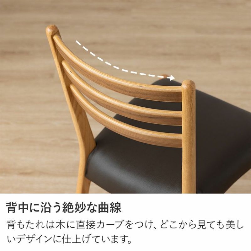 高級感溢れる天然木ダイニングセット滑らかであたたかみのある天然木ダイニング。優しい手触りが日々の暮らしの中心になる1台です。●オーク天然木を使用した美しい天板節や白太など、木本来の表情を活かしているので、この世にひとつとして同じものは存在しません。●木の質感を損なわないウレタン塗装人体に有害なトルエン・キシレンが発生しない安心な塗料を使用しているため、安心してお使いいただけます。●反り防止板天板の反りを防ぐために、天板裏には反り止め板を取り付けています。●優しく滑らかな角の処理天板のフチは角が出ないように加工を施し、優しい手触りに仕上げています。●天板をしっかり支える4本脚脚は天板のフォルムに合う丸みを持たせ、安定感のあるハの字脚構造になっています。●ガタつき防止のアジャスター床面との調節ができ、多少凹凸のある場所でも水平に設置できます。●天然木によるナチュラル感とあたたかみウォールナットの背もたれとオークのフレームを組み合わせたツートン仕様のダイニングチェアです。●持ち運びが簡単な軽量チェア軽量なので女性やお子様でも簡単に持ち上げられ、お掃除も楽に行えます。●背中に沿う絶妙な曲線背もたれは木に直接カーブをつけ、どこから見ても美しいデザインに仕上げています。●ツートンカラーウォールナット材とオーク材を組み合わせたデザインはモダンでおしゃれな空間を演出します。●体を支える背もたれ背もたれは絶妙な傾斜により、無理なく体を支えてくれるので、ゆったりと体を預けることができます。●適度な弾力の座り心地チェアとベンチの座面は適度な弾力のある座り心地で、座面の幅が広めなのでゆったり座ることができます。●お手入れ簡単なPVCレザーチェアとベンチの座面はPVCなので水分に強く、汚れてもサッと拭き取るだけなのでお手入れも簡単です。●使い勝手のいいシンプルなベンチ背もたれのないデザインは圧迫感がなく、コンパクトなスペースにもおすすめです。