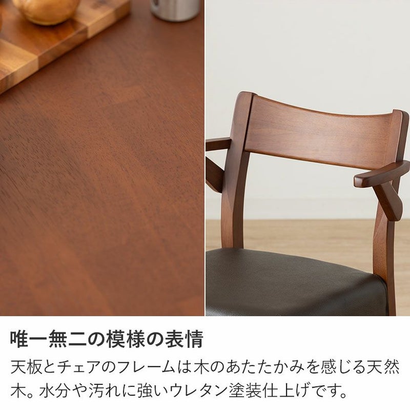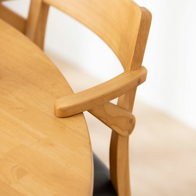 壁際に付けて使用したり、ソファーの背面に付けて使用したりとお部屋を広々使える工夫も施されています。●天然木を贅沢に使用したダイニングテーブル節や白太など、木本来の表情を活かしているので、この世にひとつとして同じものは存在しません。●優しく滑らかな角の処理天板のフチは角が出ないように加工を施し、優しい手触りに仕上げています。●反り防止金具テーブル天板裏面には木材の反り防止のための金具がはめ込んであります。●2本脚で出入りもしやすく2本脚にすることで、すっきりとした見た目に加え、椅子の出し入れや足入れも楽に行えます。安定感を高める中板脚部には2本の脚を繋ぐ中板があり、強度が高まるので安定感も増します。●ガタつき防止のアジャスター床面との調節ができ、多少凸凹のある場所でも水平に設置できます。●天然木のあたたかみを感じられるチェア天然木ならではの高級感が漂い、細身のフレームが美しくスタイリッシュなデザインです。●持ち運びが簡単な軽量チェア軽量なので女性やお子様でも簡単に持ち上げられ、お掃除も楽に行えます。●ローバックタイプ背が低いローバックタイプなので、お部屋に圧迫感を与えにくくなっています。●唯一無二の模様の表情チェアのフレームは木のあたたかみを感じる天然木。水分や汚れに強いウレタン塗装で仕上げています。●背中に沿う絶妙な曲線背もたれは木に直接カーブをつけ、どこから見ても美しいデザインに仕上げています。●肘掛け付き肘掛け部分には立ち座りの際に邪魔になりにくいハーフアームを採用しています。●テーブルに掛けてお掃除簡単肘掛けをテーブルに掛けることができるので、床のお掃除も楽に行えます。●適度な弾力の座り心地座面は適度な弾力のある座り心地で、座面の幅が広めなのでゆったり座ることができます。●お手入れ簡単なPVCレザー座面はPVCなので水分に強く、汚れてもサッと拭き取るだけなのでお手入れも簡単です。