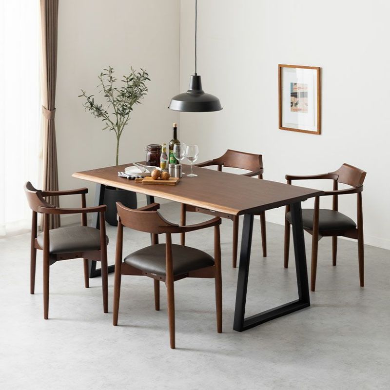 高級感溢れる天然木ダイニングセット滑らかであたたかみのある天然木ダイニング。優しい手触りが日々の暮らしの中心になる1台です。●重厚感のある天然の耳を演出したテーブルサイドの波打った「耳」と呼ばれる部分が、1枚板の風合いを思わせる趣のあるデザインです。●天然木を贅沢に使用したダイニングテーブル節や白太など、木本来の表情を活かしているので、この世にひとつとして同じものは存在しません。●凹凸のある、天然の耳を演出天板長辺にあえて波打つデザインを施し、天然木らしい温かみある風合いを創造しています。●反り防止金具テーブル天板裏面には木材の反り防止のための金具がはめ込んであります。●天板をしっかり支えるロの字脚脚は多角形になっていて、シンプルでオシャレなデザイン。台形に固定されているので、安定感があります。●選べる脚脚は左からブラック、オーク、ウォールナットの3種類。お部屋の雰囲気に合わせてお選びいただけます。●ガタつき防止のアジャスター床面との調節ができ、多少凸凹のある場所でも水平に設置できます。●天然木のあたたかみを感じられるチェア弧を描いた天然木の背もたれが、主張しすぎない存在感を作り出します。●唯一無二の模様の表情チェアのフレームは木のあたたかみを感じる天然木。水分や汚れに強いウレタン塗装で仕上げています。●背中に沿う絶妙な曲線背もたれは木に直接カーブをつけ、どこから見ても美しいデザインに仕上げています。●背もたれと繋がるデザインの肘掛け背もたれからなだらかに続くアームレストは包み込むようなデザインでフィット感のある使い心地です。●適度な弾力の座り心地座面は適度な弾力のある座り心地で、座面の幅が広めなのでゆったり座ることができます。●お手入れ簡単なPVCレザー座面はPVCなので水分に強く、汚れてもサッと拭き取るだけなのでお手入れも簡単です。