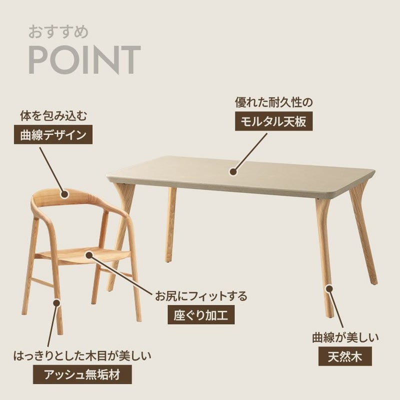 重厚感のあるモルタル天板とあたたかみのある無垢材を組み合わせた、異素材ダイニングセットです。