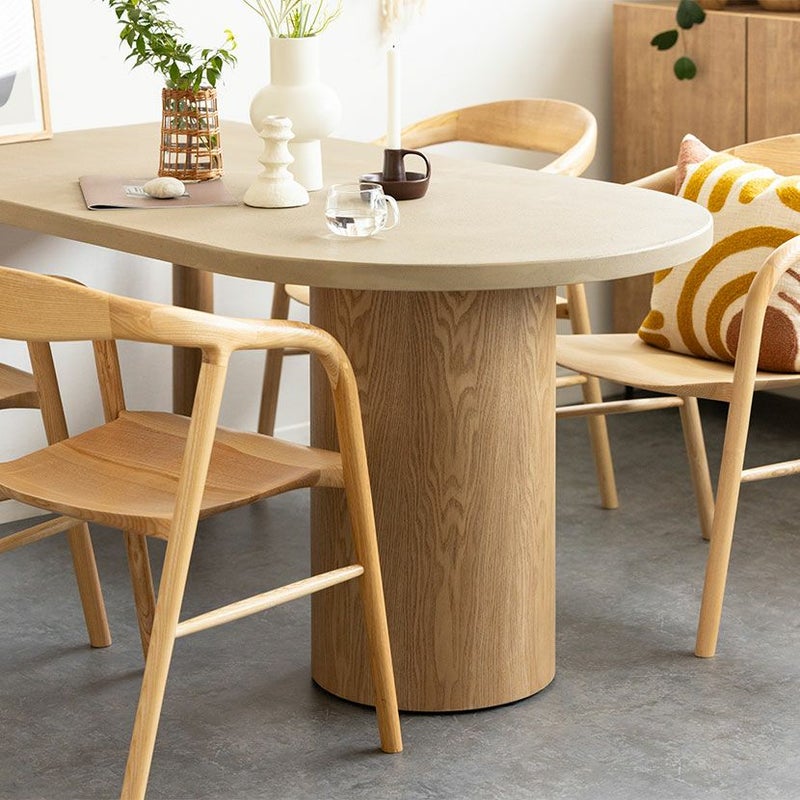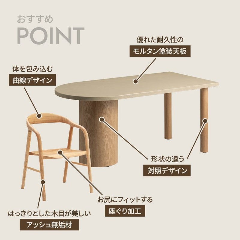 重厚感のあるモルタル天板と、あたたかみのある無垢材を組み合わせた、異素材のダイニングセットです。