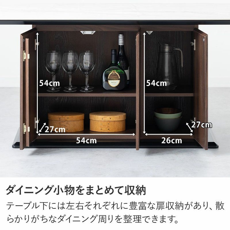 テーブル下には左右それぞれに豊富な扉収納があり、散らかりがちなダイニング周りを整理できます。