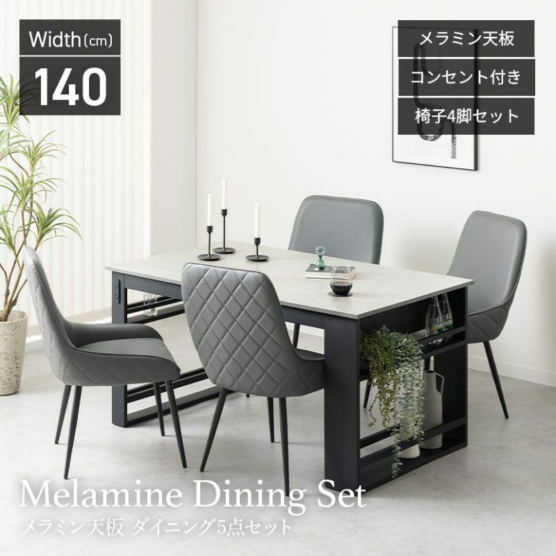 便利な収納棚付きのテーブルとグレーのチェアの組み合わせがモダンなダイニングセットです。