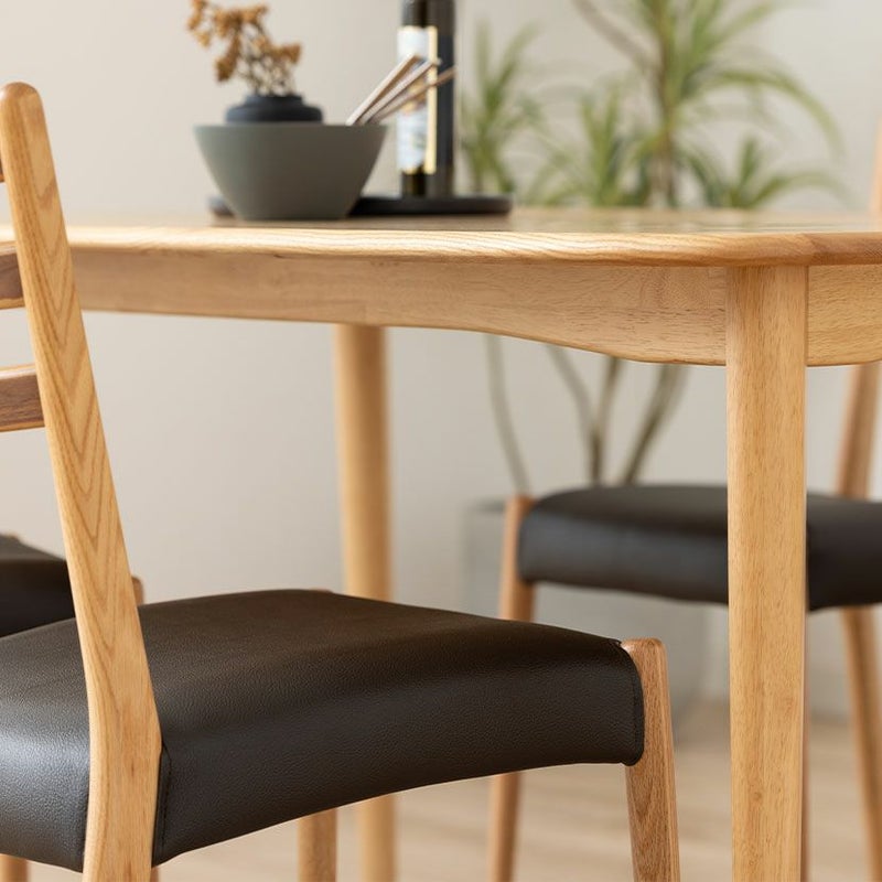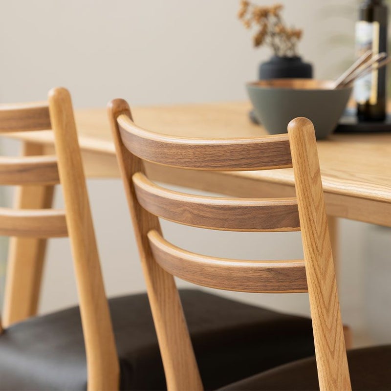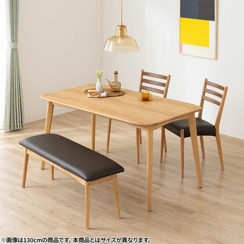 高級感溢れる天然木ダイニングセット滑らかであたたかみのある天然木ダイニング。優しい手触りが日々の暮らしの中心になる1台です。●オーク天然木を使用した美しい天板節や白太など、木本来の表情を活かしているので、この世にひとつとして同じものは存在しません。●木の質感を損なわないウレタン塗装人体に有害なトルエン・キシレンが発生しない安心な塗料を使用しているため、安心してお使いいただけます。●反り防止板天板の反りを防ぐために、天板裏には反り止め板を取り付けています。●優しく滑らかな角の処理天板のフチは角が出ないように加工を施し、優しい手触りに仕上げています。●天板をしっかり支える4本脚脚は天板のフォルムに合う丸みを持たせ、安定感のあるハの字脚構造になっています。●ガタつき防止のアジャスター床面との調節ができ、多少凹凸のある場所でも水平に設置できます。●天然木によるナチュラル感とあたたかみウォールナットの背もたれとオークのフレームを組み合わせたツートン仕様のダイニングチェアです。●持ち運びが簡単な軽量チェア軽量なので女性やお子様でも簡単に持ち上げられ、お掃除も楽に行えます。●背中に沿う絶妙な曲線背もたれは木に直接カーブをつけ、どこから見ても美しいデザインに仕上げています。●ツートンカラーウォールナット材とオーク材を組み合わせたデザインはモダンでおしゃれな空間を演出します。●体を支える背もたれ背もたれは絶妙な傾斜により、無理なく体を支えてくれるので、ゆったりと体を預けることができます。●適度な弾力の座り心地チェアとベンチの座面は適度な弾力のある座り心地で、座面の幅が広めなのでゆったり座ることができます。●お手入れ簡単なPVCレザーチェアとベンチの座面はPVCなので水分に強く、汚れてもサッと拭き取るだけなのでお手入れも簡単です。●使い勝手のいいシンプルなベンチ背もたれのないデザインは圧迫感がなく、コンパクトなスペースにもおすすめです。