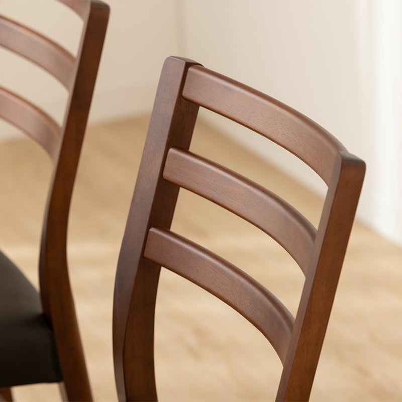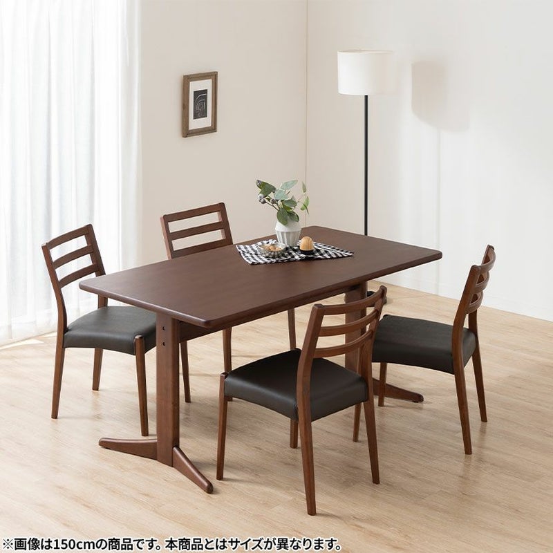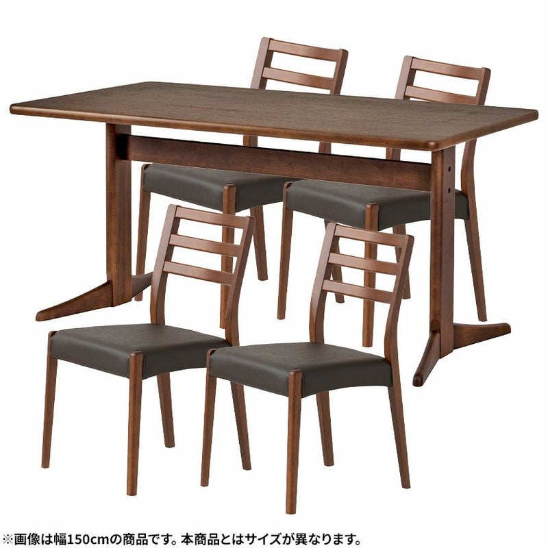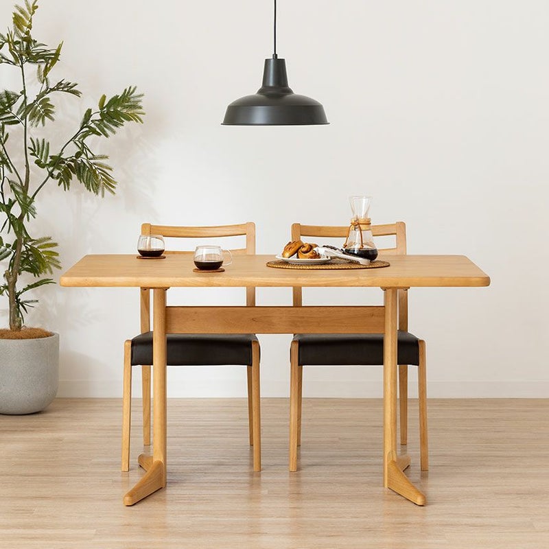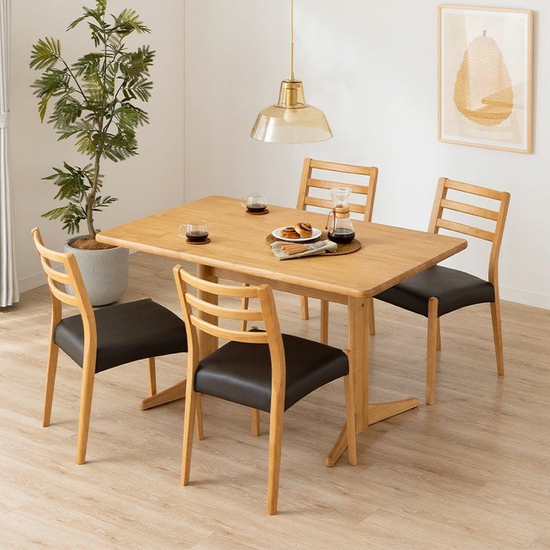 高級感溢れる天然木ダイニングセット滑らかであたたかみのある天然木ダイニング。優しい手触りが日々の暮らしの中心になる1台です。●天然木を贅沢に使用したダイニングテーブル節や白太など、木本来の表情を活かしているので、この世にひとつとして同じものは存在しません。●優しく滑らかな角の処理天板のフチは角が出ないように加工を施し、優しい手触りに仕上げています。●反り防止金具テーブル天板裏面には木材の反り防止のための金具がはめ込んであります。●2本脚で出入りもしやすく2本脚にすることで、すっきりとした見た目に加え、椅子の出し入れや足入れも楽に行えます。安定感を高める中板脚部には2本の脚を繋ぐ中板があり、強度が高まるので安定感も増します。●ガタつき防止のアジャスター床面との調節ができ、多少凸凹のある場所でも水平に設置できます。●天然木のあたたかみを感じられるチェア天然木のあたたかみ溢れるルーバーデザインチェア。ブラックの座面がデザイン全体を引き締めます。●持ち運びが簡単な軽量チェア軽量なので女性やお子様でも簡単に持ち上げられ、お掃除も楽に行えます。●軽やかなフォルムデザインチェアのフレームは木のあたたかみを感じる天然木。背面のルーバーデザインが軽やかさをプラスします。●背中に沿う絶妙な曲線背もたれは木に直接カーブをつけ、どこから見ても美しいデザインに仕上げています。●適度な弾力の座り心地座面は適度な弾力のある座り心地で、座面の幅が広めなのでゆったり座ることができます。●お手入れ簡単なPVCレザー座面はPVCなので水分に強く、汚れてもサッと拭き取るだけなのでお手入れも簡単です。