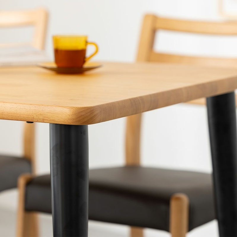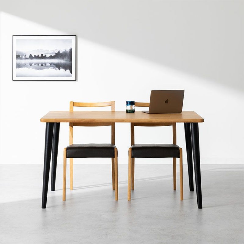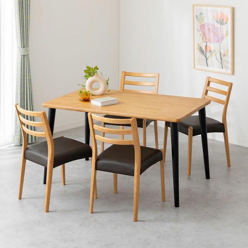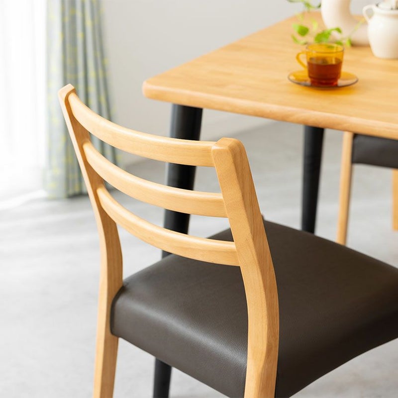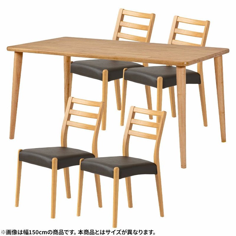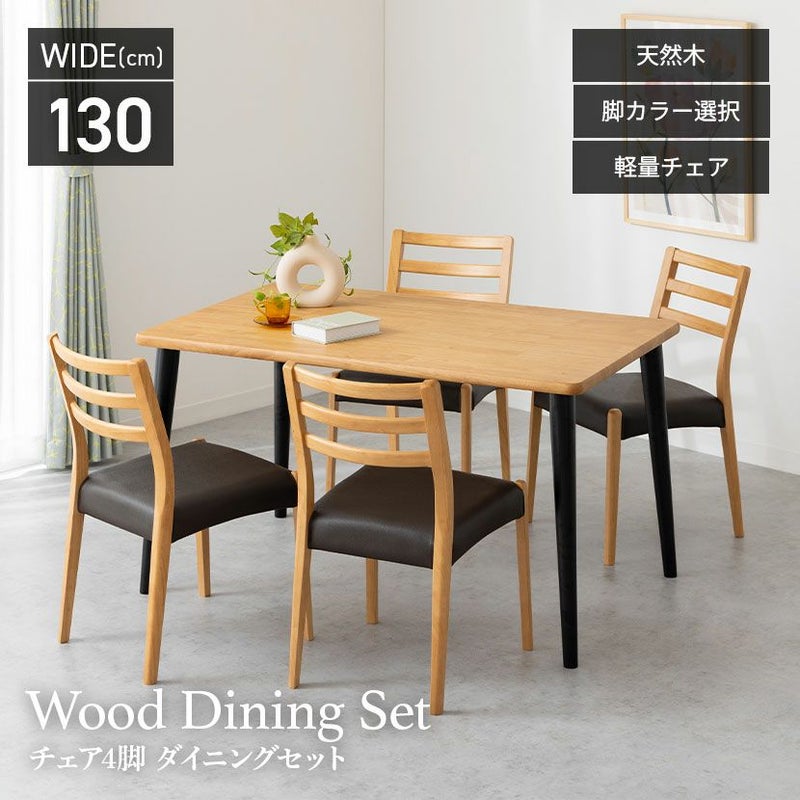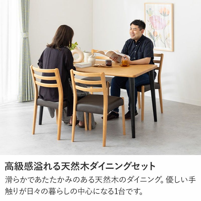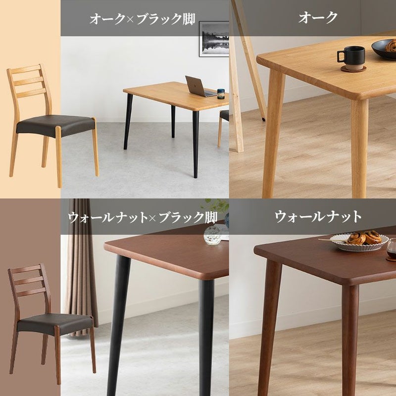高級感溢れる天然木ダイニングセット滑らかであたたかみのある天然木ダイニング。優しい手触りが日々の暮らしの中心になる1台です。●天然木を贅沢に使用したダイニングテーブル節や白太など、木本来の表情を活かしているので、この世にひとつとして同じものは存在しません。●優しく滑らかな角の処理天板のフチは角が出ないように加工を施し、優しい手触りに仕上げています。●反り防止金具テーブル天板裏面には木材の反り防止のための金具がはめ込んであります。●天板をしっかり支える4本脚脚は天板のフォルムに合う丸みを持たせ、安定感のある?の字脚構造になっています。●選べる脚脚は左からブラック、オーク、ウォールナットの3種類。お部屋の雰囲気に合わせてお選びいただけます。●ガタつき防止のアジャスター床面との調節ができ、多少凸凹のある場所でも水平に設置できます。●天然木のあたたかみを感じられるチェア天然木のあたたかみ溢れるルーバーデザインチェア。ブラックの座面がデザイン全体を引き締めます。●持ち運びが簡単な軽量チェア軽量なので女性やお子様でも簡単に持ち上げられ、お掃除も楽に行えます。●軽やかなフォルムデザインチェアのフレームは木のあたたかみを感じる天然木。背面のルーバーデザインが軽やかさをプラスします。●背中に沿う絶妙な曲線背もたれは木に直接カーブをつけ、どこから見ても美しいデザインに仕上げています。●適度な弾力の座り心地座面は適度な弾力のある座り心地で、座面の幅が広めなのでゆったり座ることができます。●お手入れ簡単なPVCレザー座面はPVCなので水分に強く、汚れてもサッと拭き取るだけなのでお手入れも簡単です。