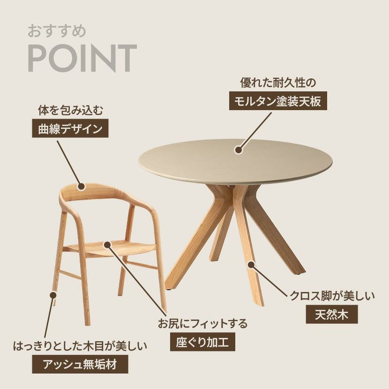 重厚感のあるモルタル天板と、あたたかみのある無垢材を組み合わせた、異素材のダイニングセットです。