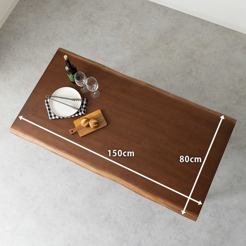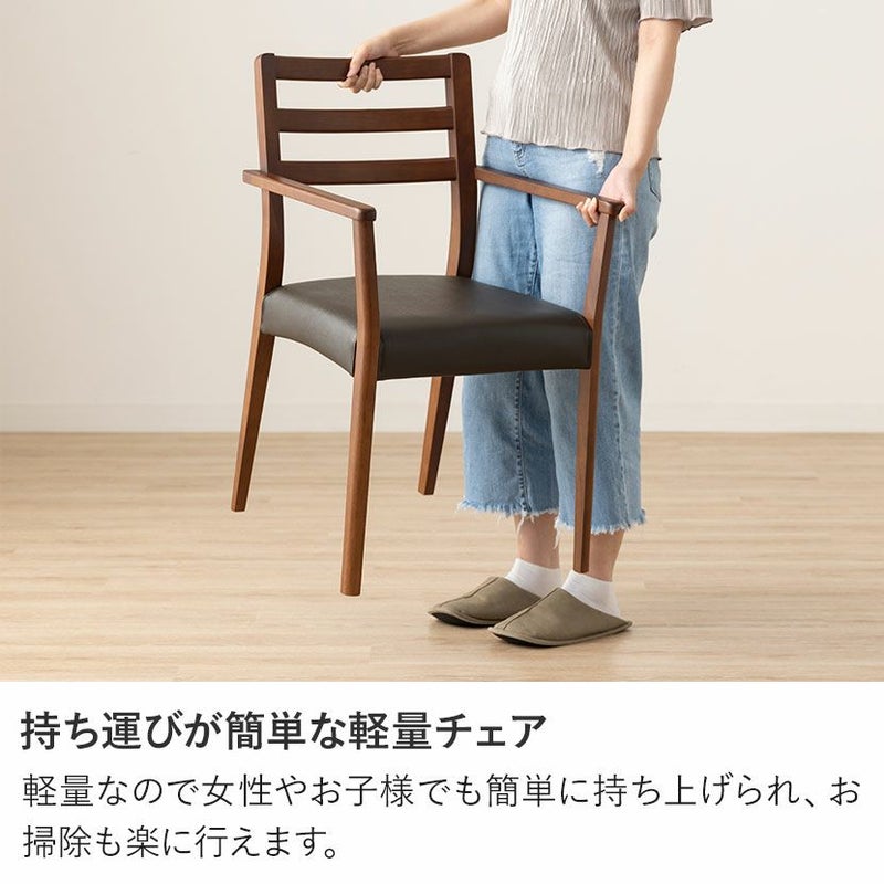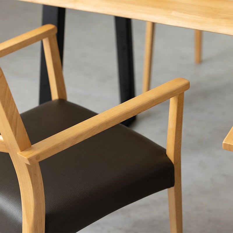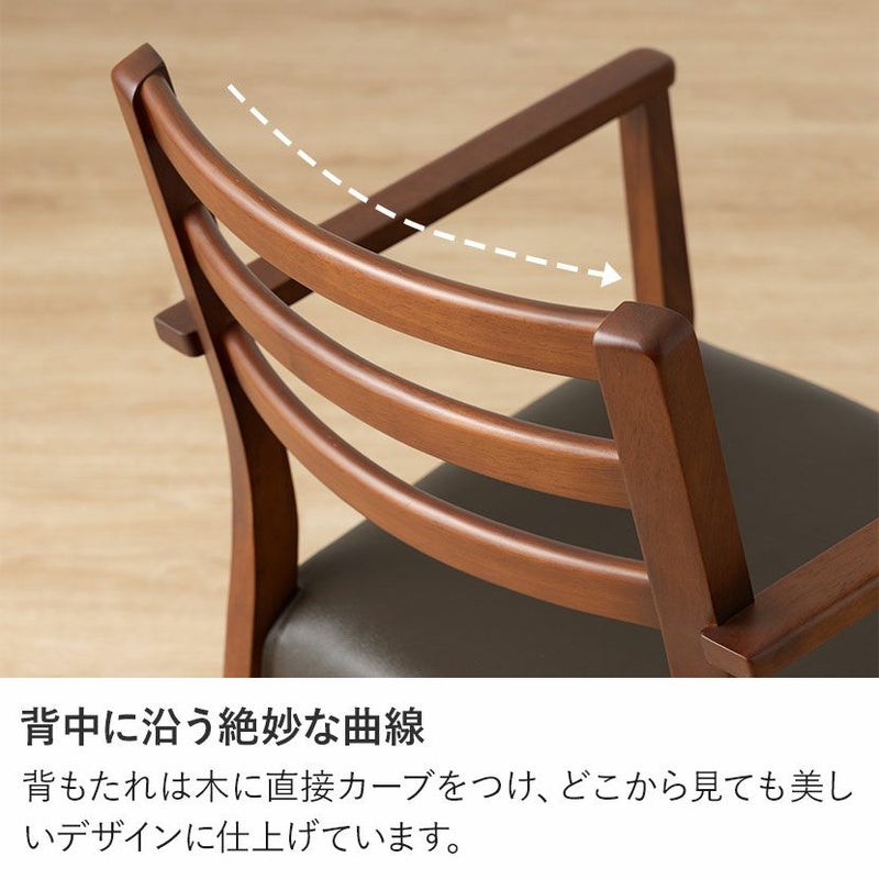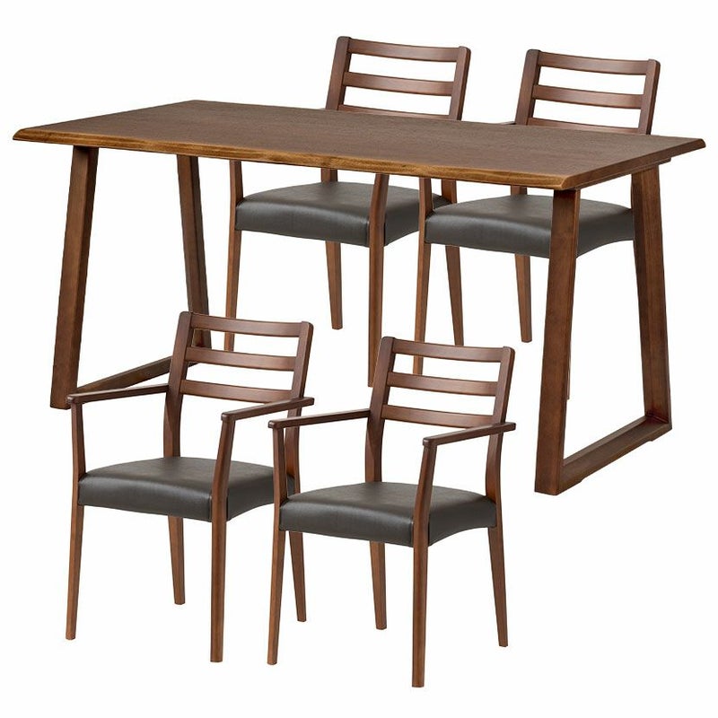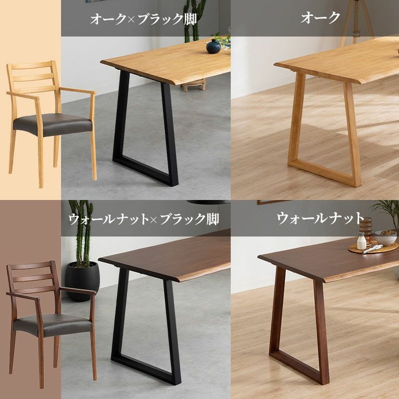 高級感溢れる天然木ダイニングセット滑らかであたたかみのある天然木ダイニング。優しい手触りが日々の暮らしの中心になる1台です。●重厚感のある天然の耳を演出したテーブルサイドの波打った「耳」と呼ばれる部分が、1枚板の風合いを思わせる趣のあるデザインです。●天然木を贅沢に使用したダイニングテーブル節や白太など、木本来の表情を活かしているので、この世にひとつとして同じものは存在しません。●凹凸のある、天然の耳を演出天板長辺にあえて波打つデザインを施し、天然木らしい温かみある風合いを創造しています。●反り防止金具テーブル天板裏面には木材の反り防止のための金具がはめ込んであります。●天板をしっかり支えるロの字脚脚は多角形になっていて、シンプルでオシャレなデザイン。台形に固定されているので、安定感があります。●選べる脚脚は左からブラック、オーク、ウォールナットの3種類。お部屋の雰囲気に合わせてお選びいただけます。●ガタつき防止のアジャスター床面との調節ができ、多少凸凹のある場所でも水平に設置できます。●天然木のあたたかみを感じられるチェア天然木のあたたかみ溢れるルーバーデザインチェア。ブラックの座面がデザイン全体を引き締めます。●持ち運びが簡単な軽量チェア軽量なので女性やお子様でも簡単に持ち上げられ、お掃除も楽に行えます。●軽やかなフォルムデザインチェアのフレームは木のあたたかみを感じる天然木。背面のルーバーデザインが軽やかさをプラスします。●立ち上がりしやすい肘掛け付き肘掛けは主張しすぎない細身のデザインなので、アームチェアでありながらコンパクトなサイズ感です。●背中に沿う絶妙な曲線背もたれは木に直接カーブをつけ、どこから見ても美しいデザインに仕上げています。●適度な弾力の座り心地座面は適度な弾力のある座り心地で、座面の幅が広めなのでゆったり座ることができます。●お手入れ簡単なPVCレザー座面はPVCなので水分に強く、汚れてもサッと拭き取るだけなのでお手入れも簡単です。