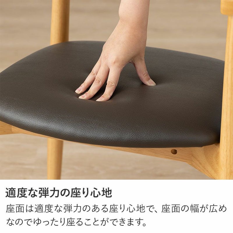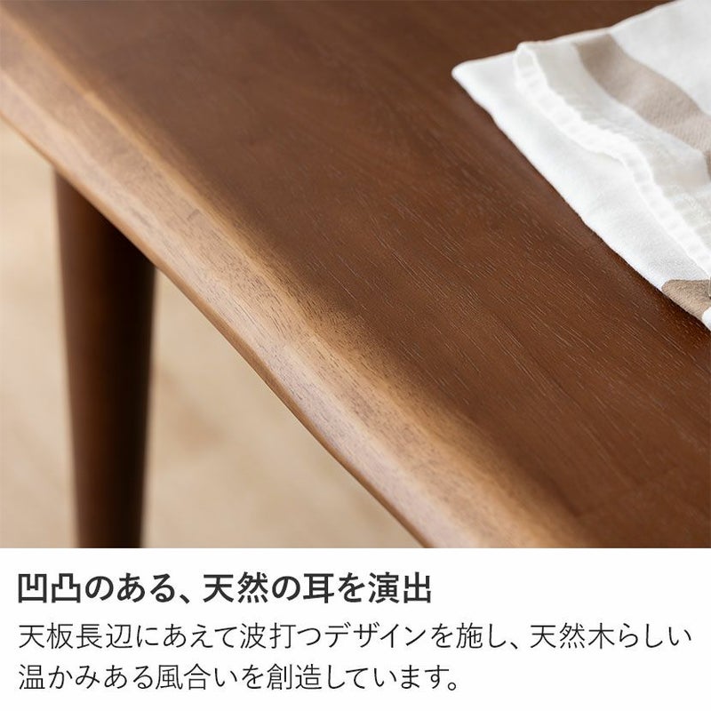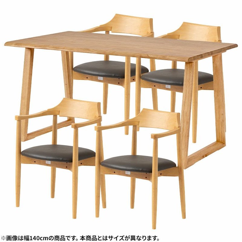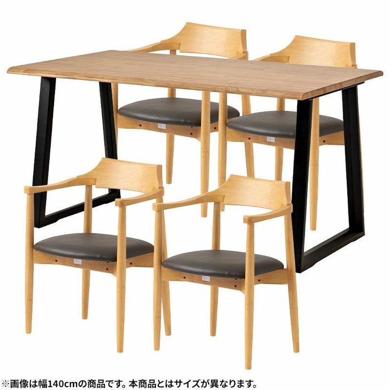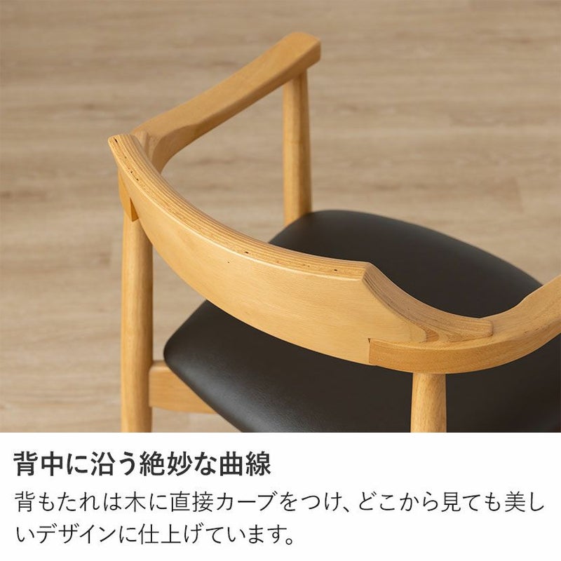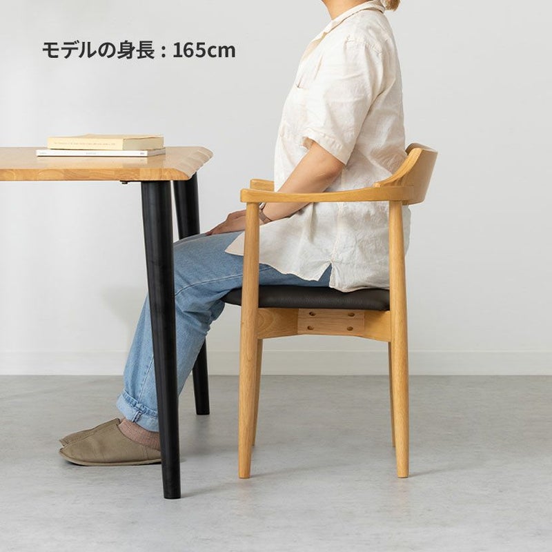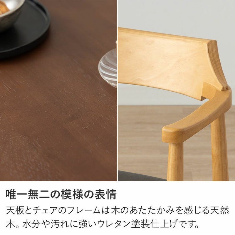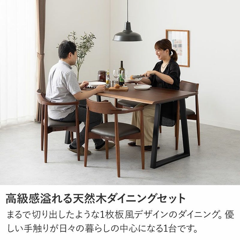 高級感溢れる天然木ダイニングセット滑らかであたたかみのある天然木ダイニング。優しい手触りが日々の暮らしの中心になる1台です。●重厚感のある天然の耳を演出したテーブルサイドの波打った「耳」と呼ばれる部分が、1枚板の風合いを思わせる趣のあるデザインです。●天然木を贅沢に使用したダイニングテーブル節や白太など、木本来の表情を活かしているので、この世にひとつとして同じものは存在しません。●凹凸のある、天然の耳を演出天板長辺にあえて波打つデザインを施し、天然木らしい温かみある風合いを創造しています。●反り防止金具テーブル天板裏面には木材の反り防止のための金具がはめ込んであります。●天板をしっかり支えるロの字脚脚は多角形になっていて、シンプルでオシャレなデザイン。台形に固定されているので、安定感があります。●選べる脚脚は左からブラック、オーク、ウォールナットの3種類。お部屋の雰囲気に合わせてお選びいただけます。●ガタつき防止のアジャスター床面との調節ができ、多少凸凹のある場所でも水平に設置できます。●天然木のあたたかみを感じられるチェア弧を描いた天然木の背もたれが、主張しすぎない存在感を作り出します。●唯一無二の模様の表情チェアのフレームは木のあたたかみを感じる天然木。水分や汚れに強いウレタン塗装で仕上げています。●背中に沿う絶妙な曲線背もたれは木に直接カーブをつけ、どこから見ても美しいデザインに仕上げています。●背もたれと繋がるデザインの肘掛け背もたれからなだらかに続くアームレストは包み込むようなデザインでフィット感のある使い心地です。●適度な弾力の座り心地座面は適度な弾力のある座り心地で、座面の幅が広めなのでゆったり座ることができます。●お手入れ簡単なPVCレザー座面はPVCなので水分に強く、汚れてもサッと拭き取るだけなのでお手入れも簡単です。