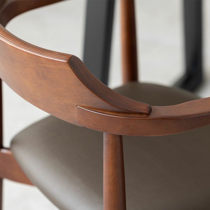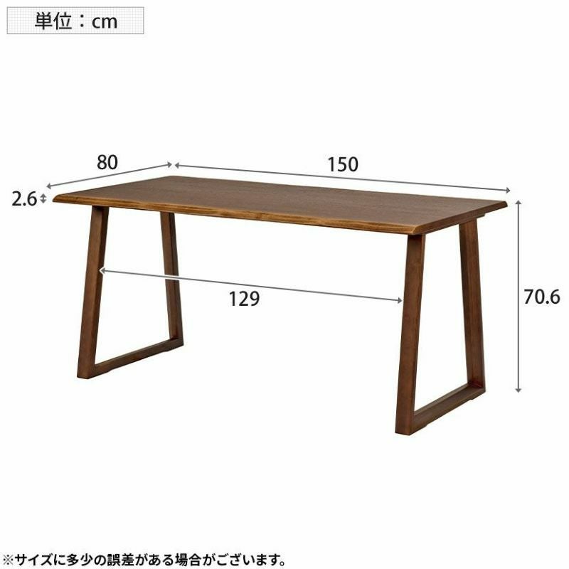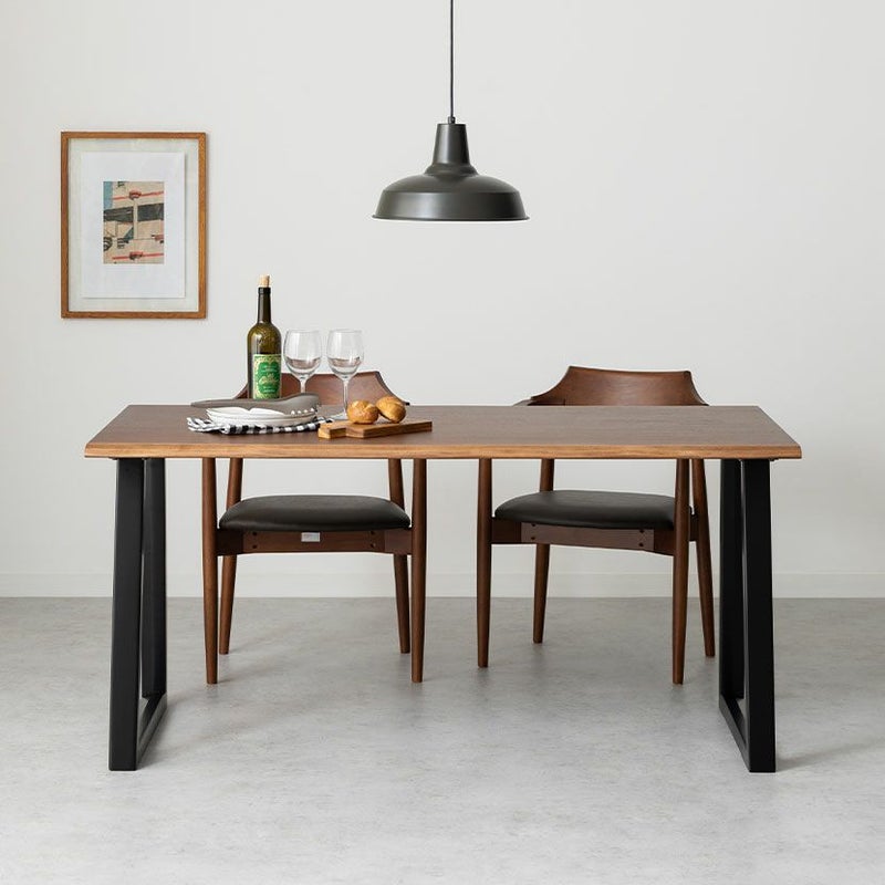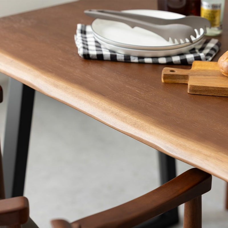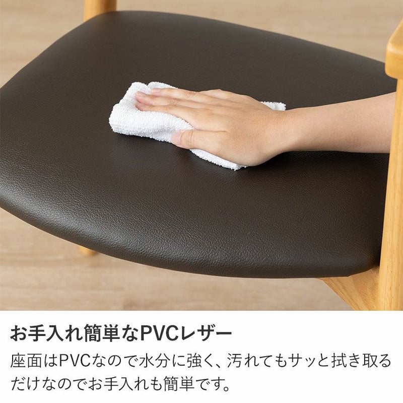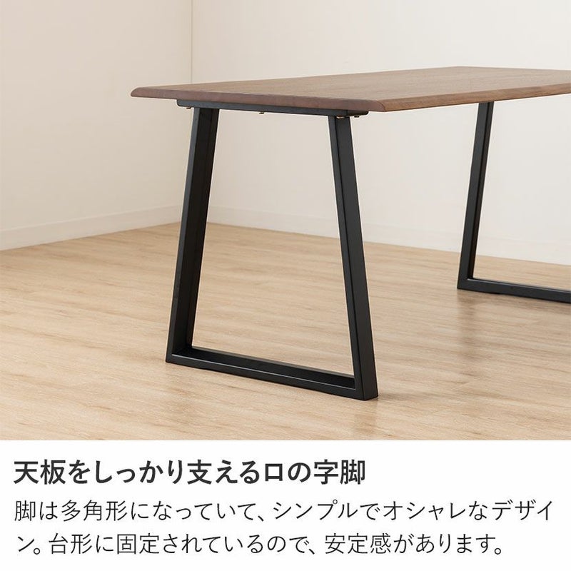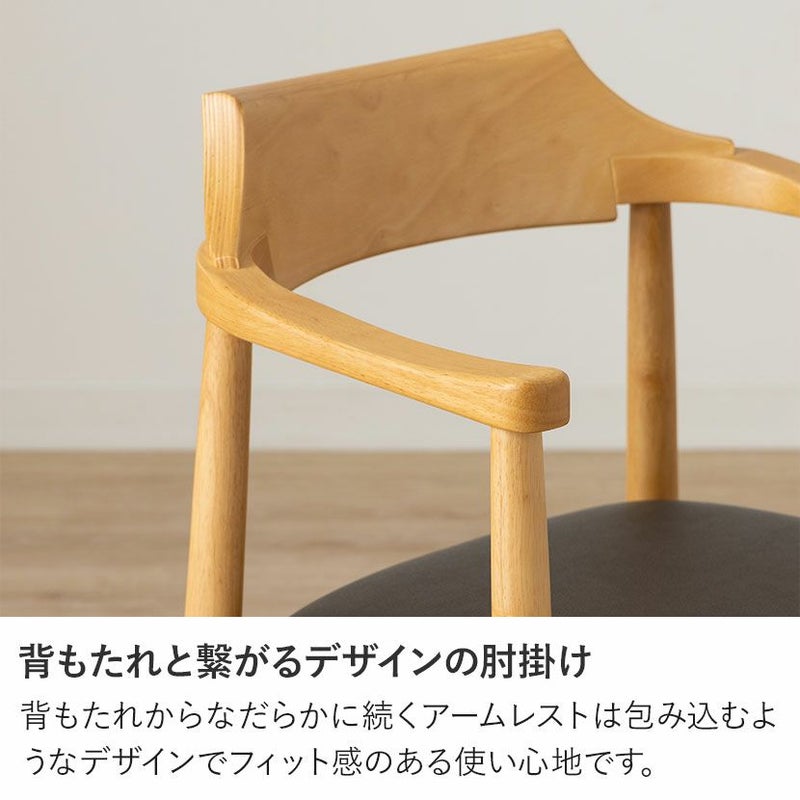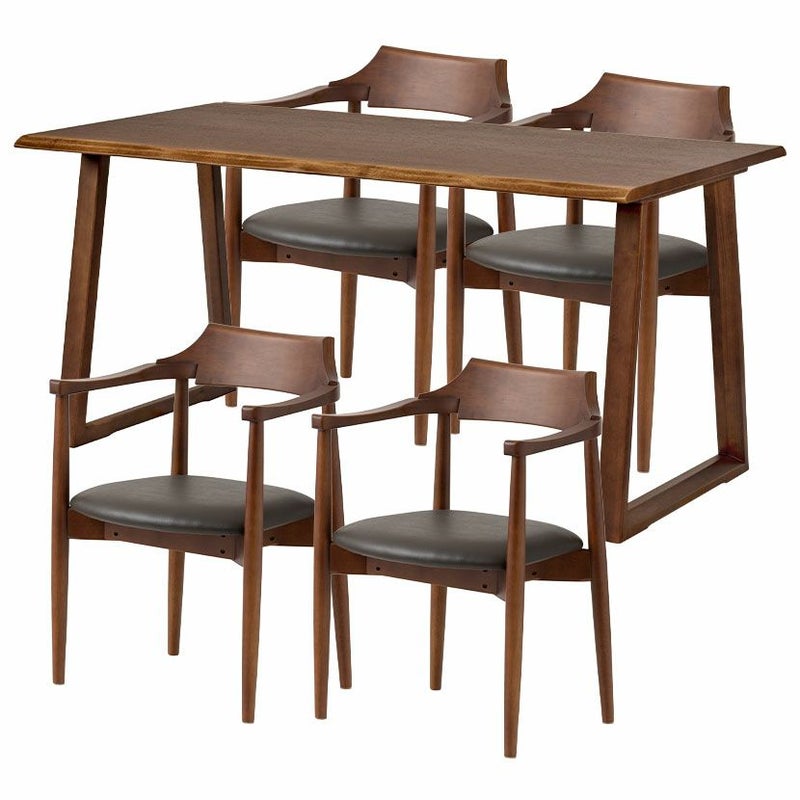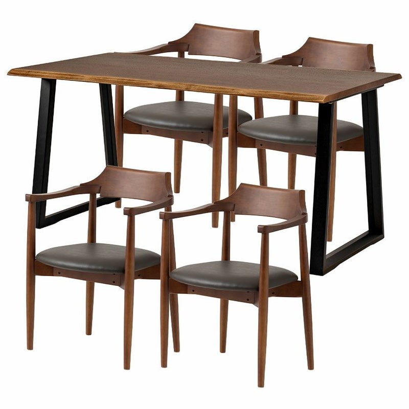 高級感溢れる天然木ダイニングセット滑らかであたたかみのある天然木ダイニング。優しい手触りが日々の暮らしの中心になる1台です。●重厚感のある天然の耳を演出したテーブルサイドの波打った「耳」と呼ばれる部分が、1枚板の風合いを思わせる趣のあるデザインです。●天然木を贅沢に使用したダイニングテーブル節や白太など、木本来の表情を活かしているので、この世にひとつとして同じものは存在しません。●凹凸のある、天然の耳を演出天板長辺にあえて波打つデザインを施し、天然木らしい温かみある風合いを創造しています。●反り防止金具テーブル天板裏面には木材の反り防止のための金具がはめ込んであります。●天板をしっかり支えるロの字脚脚は多角形になっていて、シンプルでオシャレなデザイン。台形に固定されているので、安定感があります。●選べる脚脚は左からブラック、オーク、ウォールナットの3種類。お部屋の雰囲気に合わせてお選びいただけます。●ガタつき防止のアジャスター床面との調節ができ、多少凸凹のある場所でも水平に設置できます。●天然木のあたたかみを感じられるチェア弧を描いた天然木の背もたれが、主張しすぎない存在感を作り出します。●唯一無二の模様の表情チェアのフレームは木のあたたかみを感じる天然木。水分や汚れに強いウレタン塗装で仕上げています。●背中に沿う絶妙な曲線背もたれは木に直接カーブをつけ、どこから見ても美しいデザインに仕上げています。●背もたれと繋がるデザインの肘掛け背もたれからなだらかに続くアームレストは包み込むようなデザインでフィット感のある使い心地です。●適度な弾力の座り心地座面は適度な弾力のある座り心地で、座面の幅が広めなのでゆったり座ることができます。●お手入れ簡単なPVCレザー座面はPVCなので水分に強く、汚れてもサッと拭き取るだけなのでお手入れも簡単です。