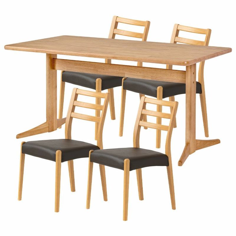 高級感溢れる天然木ダイニングセット滑らかであたたかみのある天然木ダイニング。優しい手触りが日々の暮らしの中心になる1台です。●天然木を贅沢に使用したダイニングテーブル節や白太など、木本来の表情を活かしているので、この世にひとつとして同じものは存在しません。●優しく滑らかな角の処理天板のフチは角が出ないように加工を施し、優しい手触りに仕上げています。●反り防止金具テーブル天板裏面には木材の反り防止のための金具がはめ込んであります。●2本脚で出入りもしやすく2本脚にすることで、すっきりとした見た目に加え、椅子の出し入れや足入れも楽に行えます。安定感を高める中板脚部には2本の脚を繋ぐ中板があり、強度が高まるので安定感も増します。●ガタつき防止のアジャスター床面との調節ができ、多少凸凹のある場所でも水平に設置できます。●天然木のあたたかみを感じられるチェア天然木のあたたかみ溢れるルーバーデザインチェア。ブラックの座面がデザイン全体を引き締めます。●持ち運びが簡単な軽量チェア軽量なので女性やお子様でも簡単に持ち上げられ、お掃除も楽に行えます。●軽やかなフォルムデザインチェアのフレームは木のあたたかみを感じる天然木。背面のルーバーデザインが軽やかさをプラスします。●背中に沿う絶妙な曲線背もたれは木に直接カーブをつけ、どこから見ても美しいデザインに仕上げています。●適度な弾力の座り心地座面は適度な弾力のある座り心地で、座面の幅が広めなのでゆったり座ることができます。●お手入れ簡単なPVCレザー座面はPVCなので水分に強く、汚れてもサッと拭き取るだけなのでお手入れも簡単です。