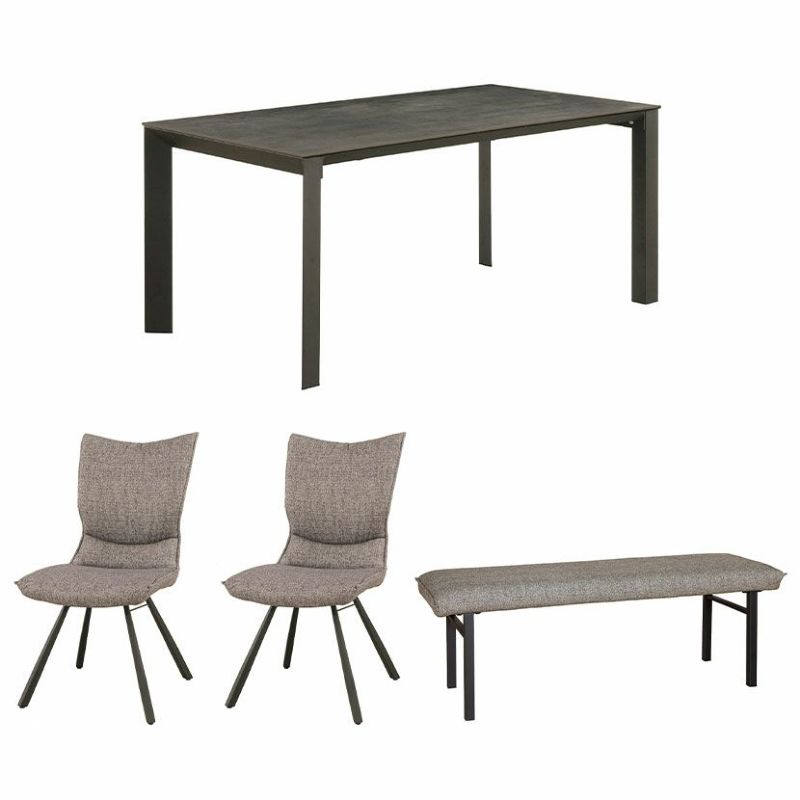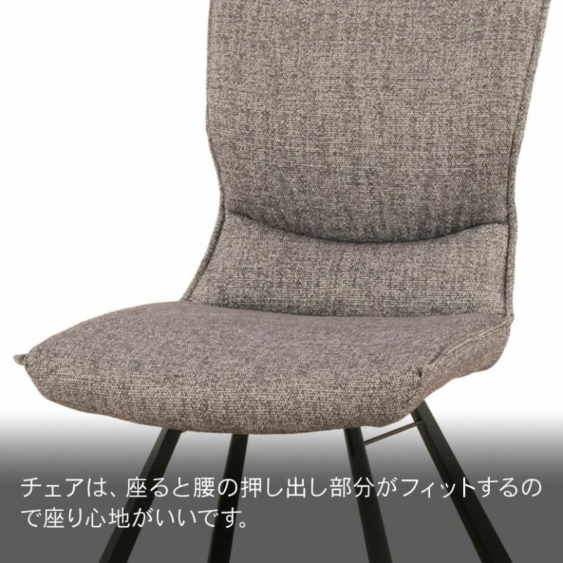 温かみのあるファブリックの張地と、スチール脚との組み合わせが特徴のチェアとベンチ。