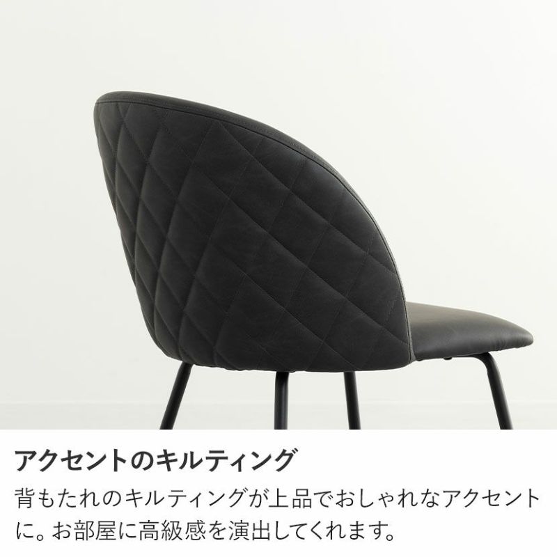 ●座面が体をしっかりキャッチゆるやかな曲線と立体的に体を包み込む形でおしりにやさしくフィットします。●アクセントのキルティング背もたれのキルティングが上品でおしゃれなアクセントに。お部屋に高級感を演出してくれます。●適度なクッション性座面は適度なクッション性で長時間のくつろぎも快適に過ごせます。●お手入れ簡単張地はEPUレザーなので汚れてもサッと拭き取るだけでお手入れが簡単です。●スタイリッシュなスチール脚脚部はしっかり強度のあるスチール脚を使用。外に向かって広くなるデザインなので安定感があります。●ガタつき防止のアジャスターチェアの脚裏には床とのガタつきを防止するアジャスターが付いています。
