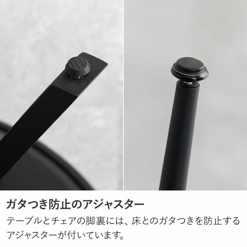 ●360°好きな位置に座れる丸テーブルはチェアを置く位置が固定されないので、限られたスペースでも置きやすい点が魅力です。●メラミナイト天板メラミンを高密度の繊維板に特殊工法で圧着させた、通常のメラミンよりも硬く、セラミックよりも軽い素材です。●メラミナイトの特徴 耐水性温湿度変化による収縮・膨張が少なく、高い寸法安定性を保持。水滴が染みこみません。●メラミナイトの特徴 耐汚性洗剤やコーヒーなどを1時間放置しても移染変化はありません。アルコール除菌も◎●メラミナイトの特徴 耐熱性180℃までの温度では変形、隆起、ひび割れなどの変化はありません。●メラミナイトの特徴 耐衝撃性強い力や衝撃を与えても目に見える損傷は見られません。●メラミナイトの特徴 耐摩耗性まな板の使用や陶器の食器類を引きずっても大丈夫です。●メラミナイトの特徴 耐紫外線色褪せにくく、長期にわたってお使いいただけます。●メラミナイトの特徴耐剥離性天板全体を圧着溶着する製造工程のため、一般的なメラミンテーブルと比べて耐剥離性に優れています。●メラミナイトの特徴 高密度通常の繊維版より内部密度が高いです。●二層構造の天板天板は高圧化粧繊維板とラバーウッド無垢材を張り合わせた二層構造になっています。●強度もデザイン性も抜群個性的な4本脚はスタイリッシュな印象を与えつつ、通常の2本脚よりも強度が高い設計となっています。●ガタつき防止のアジャスターテーブルの脚裏には床とのガタつきを防止するアジャスターが付いています。
