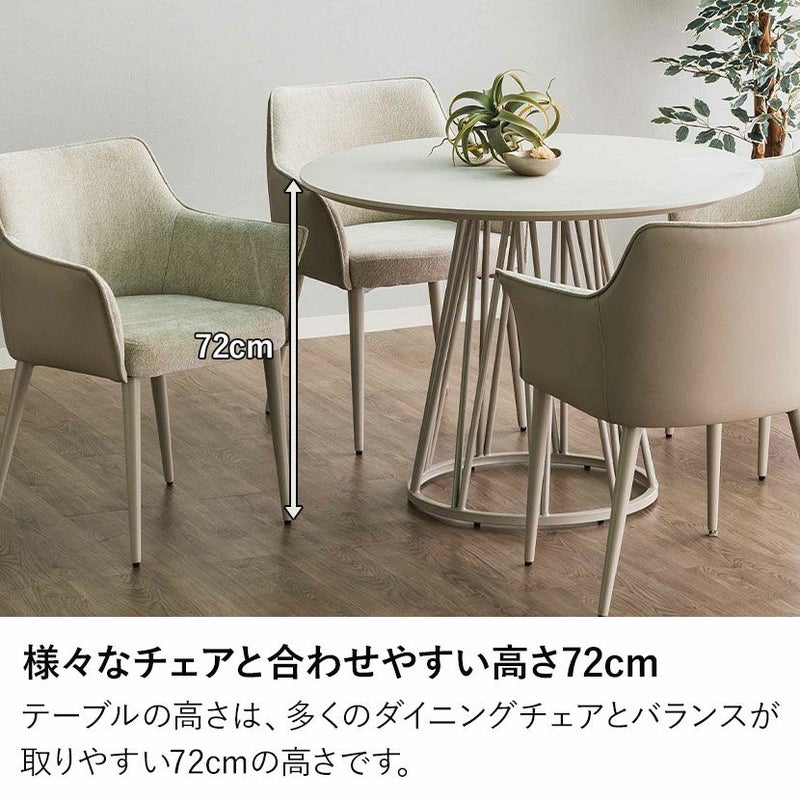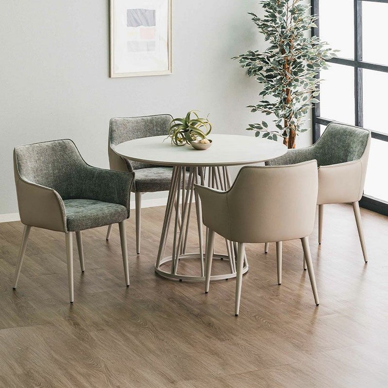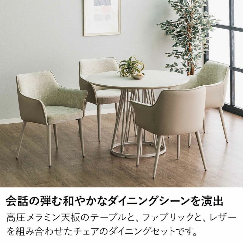 傷や熱に強い高圧メラミン天板のテーブルと、ファブリックの優しい風合いと、レザーの上品さを組み合わせたおしゃれな肘付きダイニングのチェアが、日々の食事やカフェタイムを特別な時間へと変えてくれます。