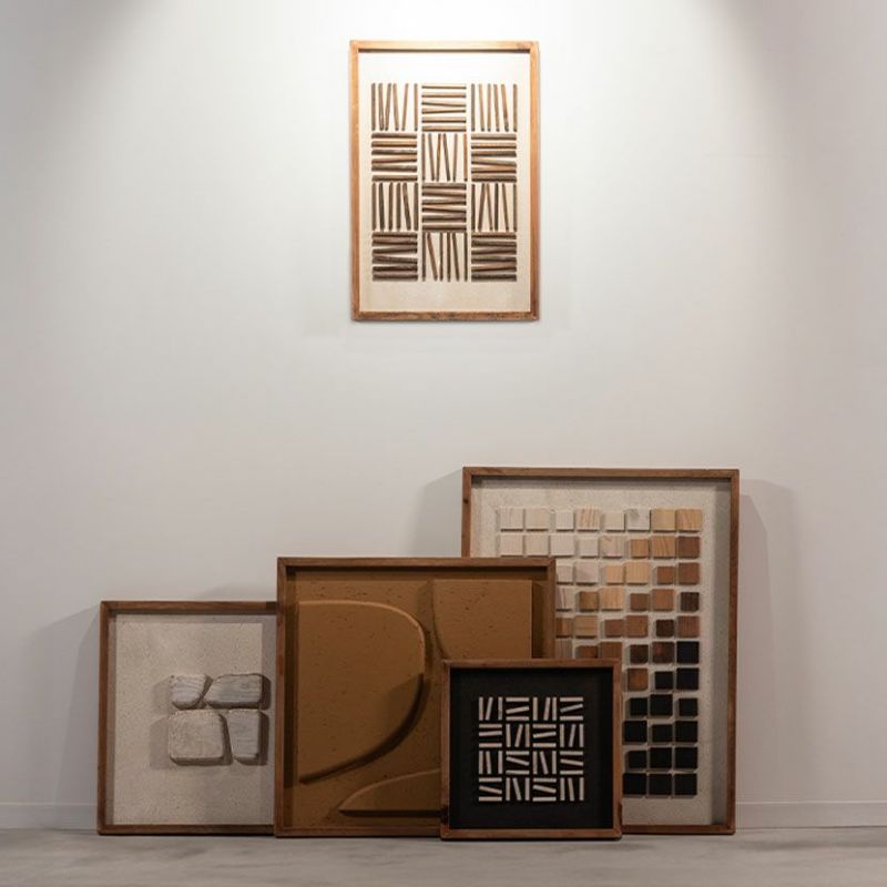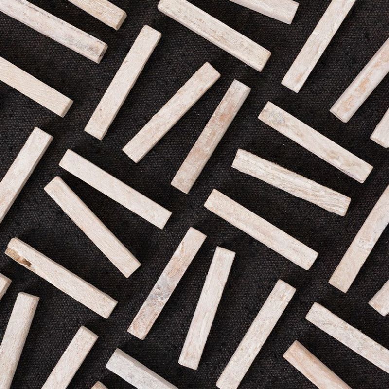 塗装したコットン帆布をベースに、古材をリズミカルに重ねることで奥行きのある立体感を生み出しています。
