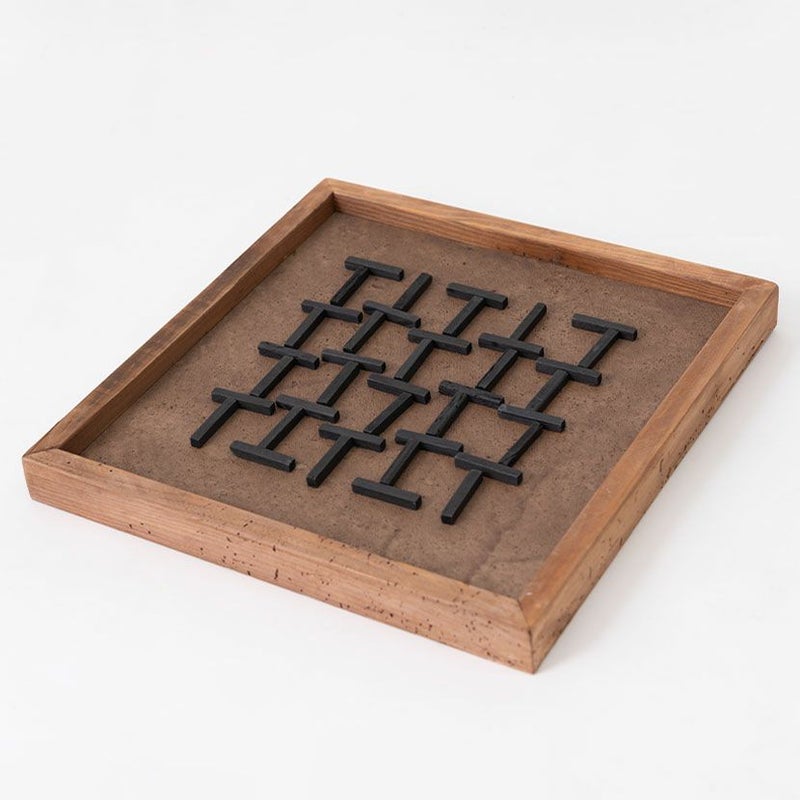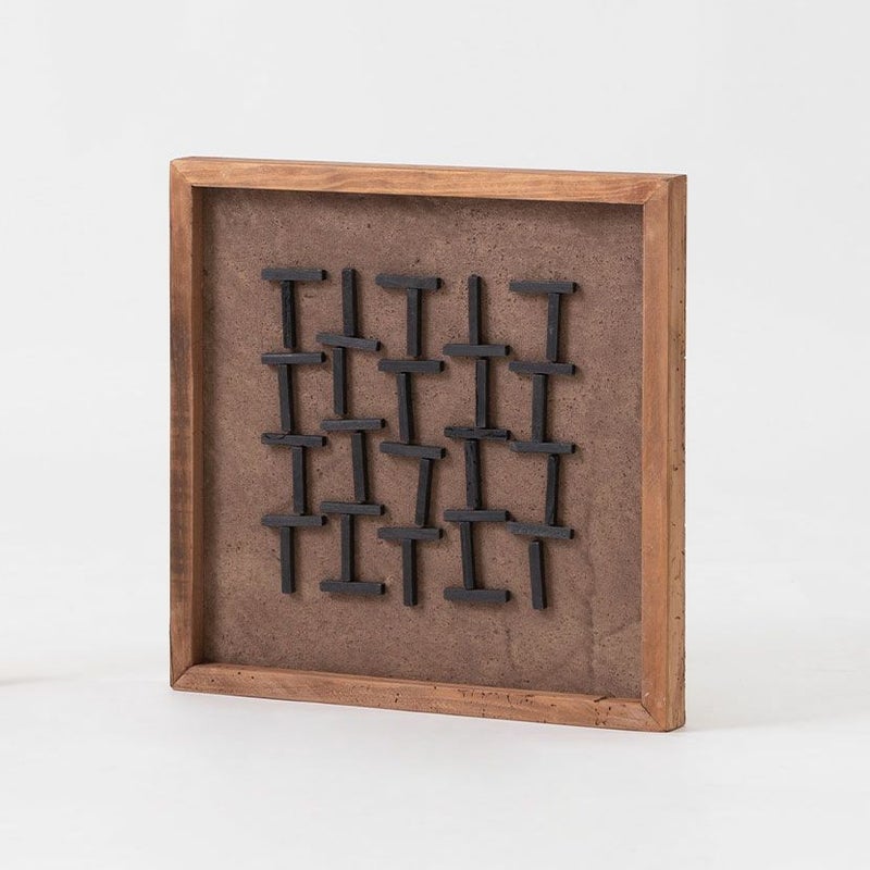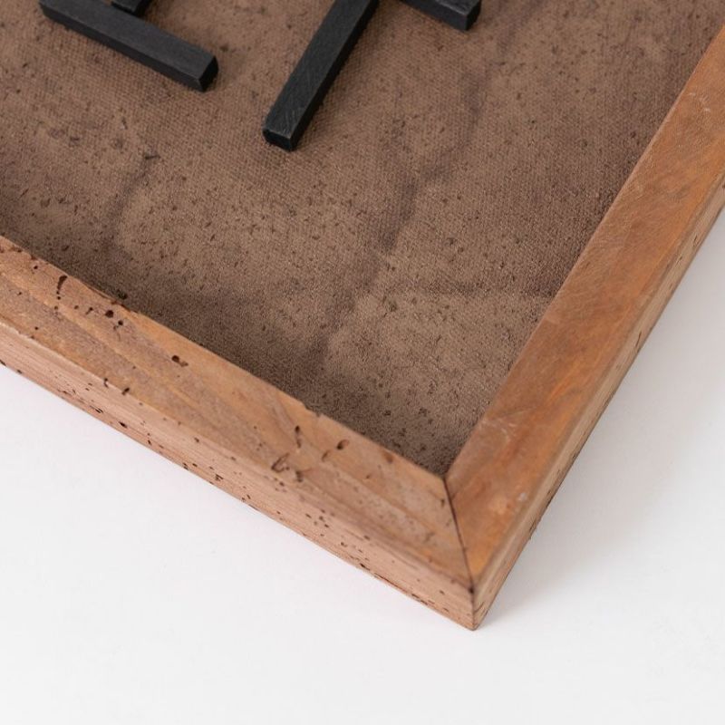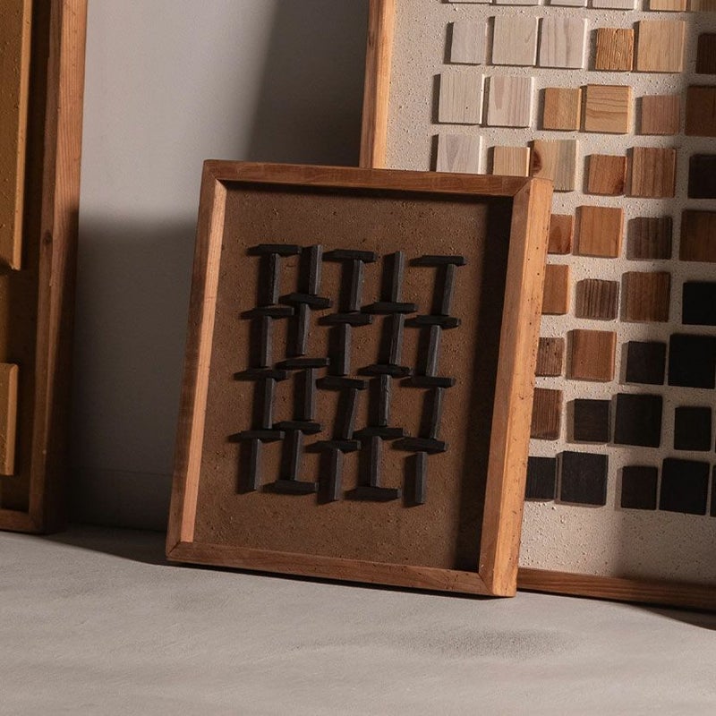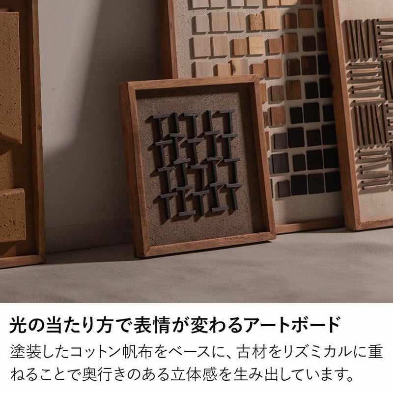 塗装したコットン帆布をベースに、古材をリズミカルに重ねることで奥行きのある立体感を生み出しています。