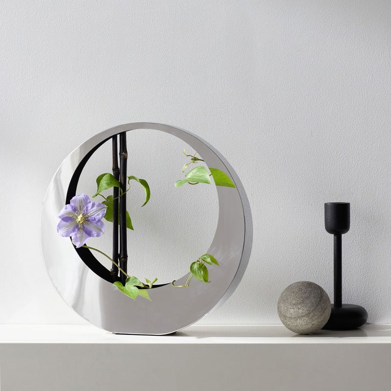 正円の幾何学フォルムと鏡面仕上げが目を引く、ステンレス製のアレンジベース。軽量かつ割れにくいため、壁掛けやハンギングなど自由なディスプレイが可能です。内側は粉体塗装仕上げで水回りにも対応。剣山も使用でき、少量の花材でも存在感のあるアレンジが楽しめます。モダンでミニマルな空間づくりにふさわしい一品です。