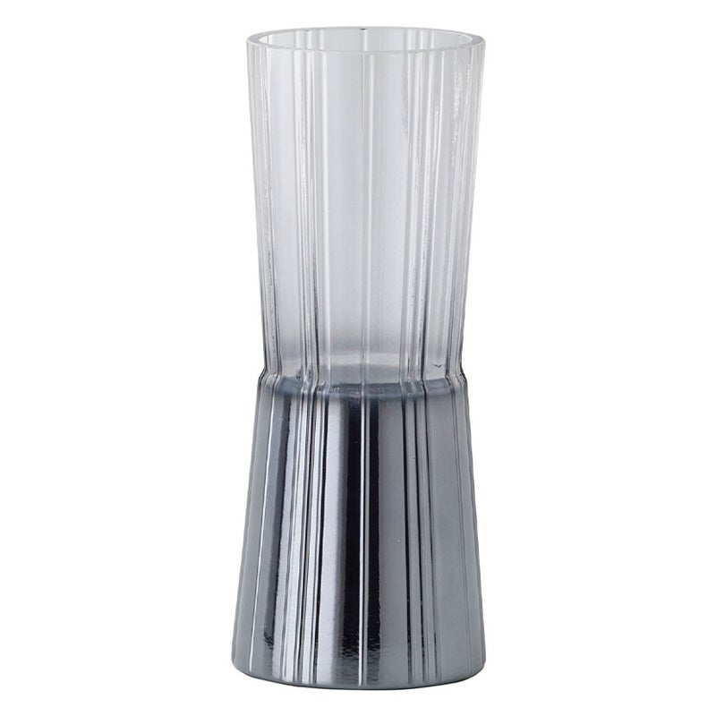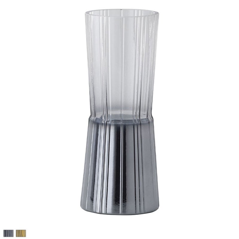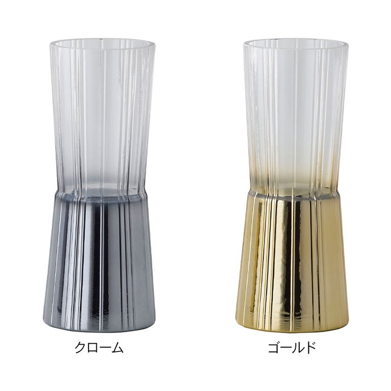 縦に刻まれたラインが特徴のガラス製フラワーベース。レトロな北欧の器を思わせるデザインに、クロームとゴールドのメッキ加工が光を反射し、空間に華やかな表情を加えます。杵型のフォルムは花が自然に収まりやすく、花材の量を問わず安定したアレンジが可能。ホリデーシーズンやイベント装飾にも映える、印象的なアイテムです。
