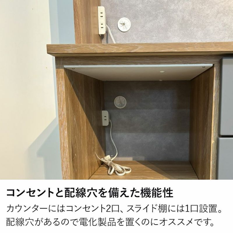 カウンターにはコンセント2口、スライド棚には1口設置。配線穴があるので電化製品を置くのにオススメです。