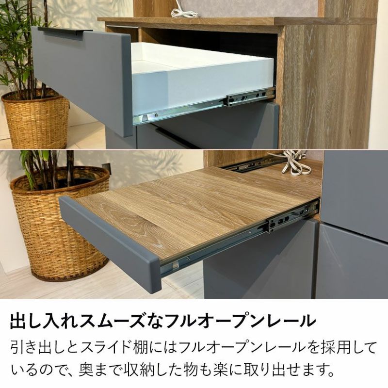 引き出しとスライド棚にはフルオープンレールを採用しているので、奥まで収納した物も楽に取り出せます。
