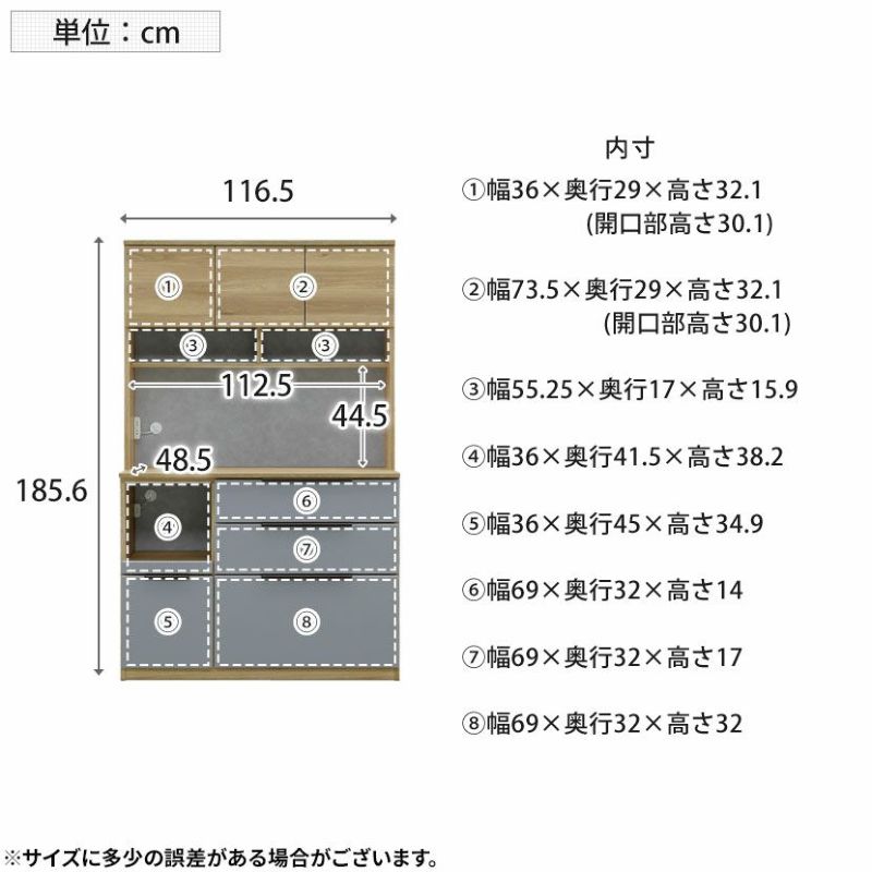 幅73.5×奥行29×高さ32.1mの上段右の開き扉は、様々な大きさの食器を収納するのにオススメです。