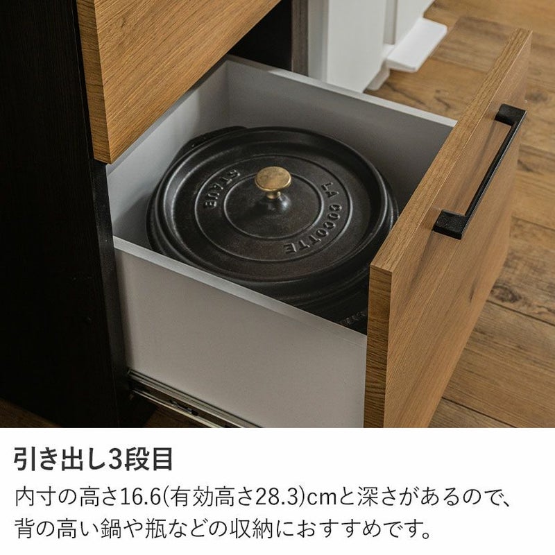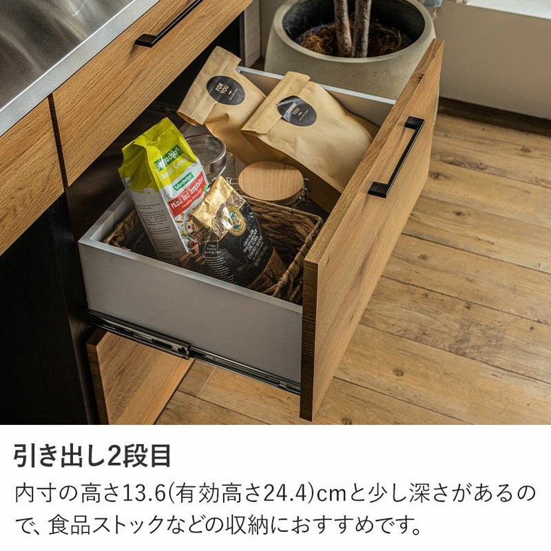 それぞれ大きさが異なるため、カトラリーや食品のストック、鍋などを分けて収納できます。
