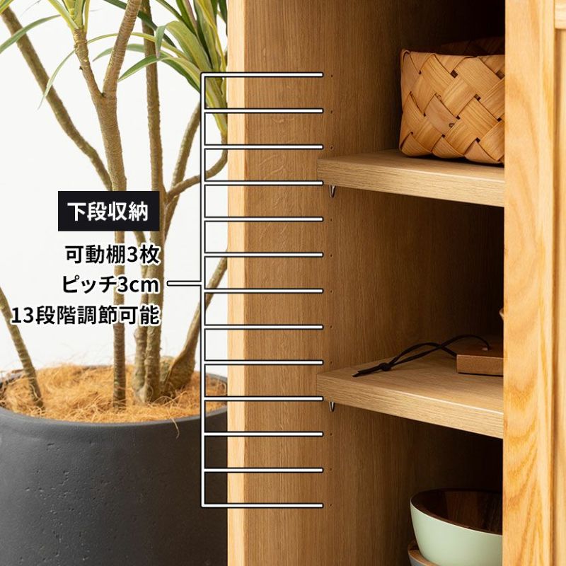 オープンスペースと引き戸内に、可動棚が付いているので、収納物に合わせて高さを調節できます。