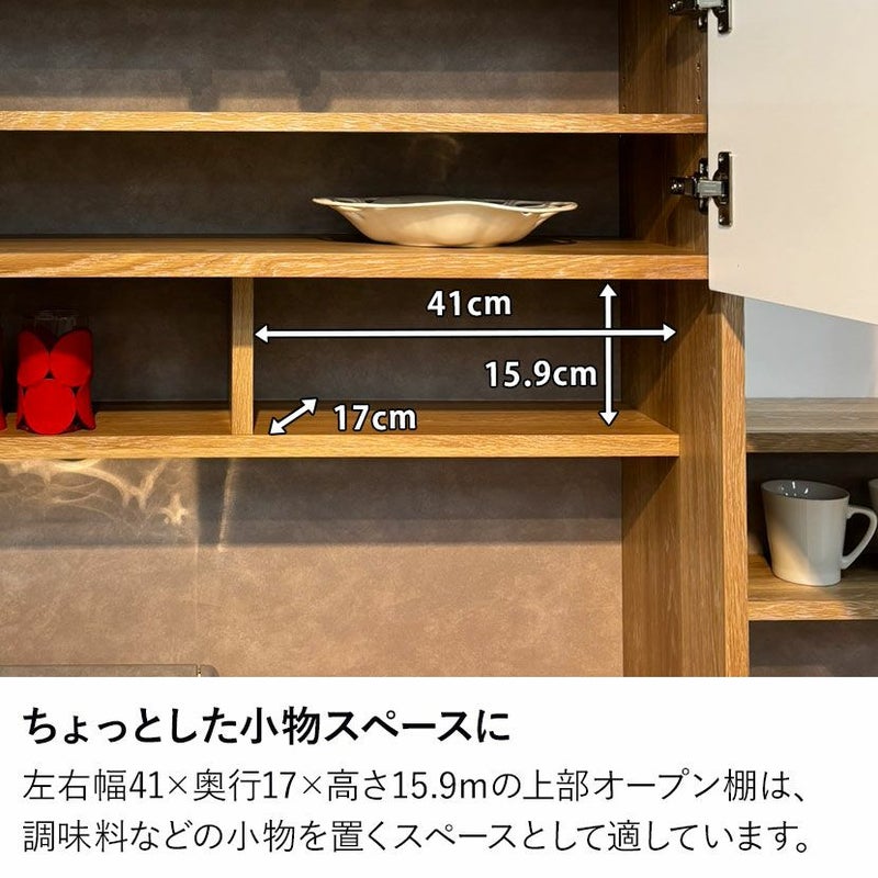 左右幅41×奥行17×高さ15.9mの上部オープン棚は、