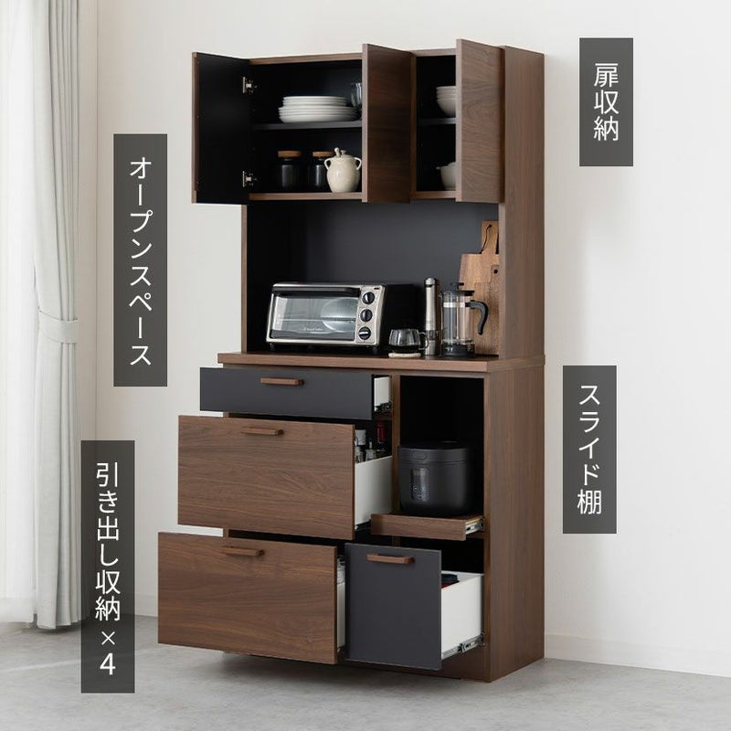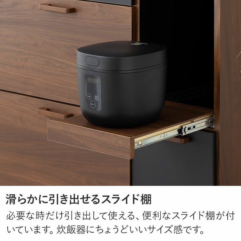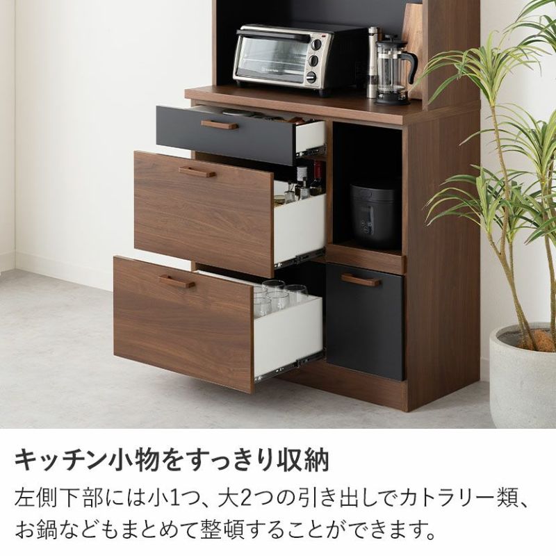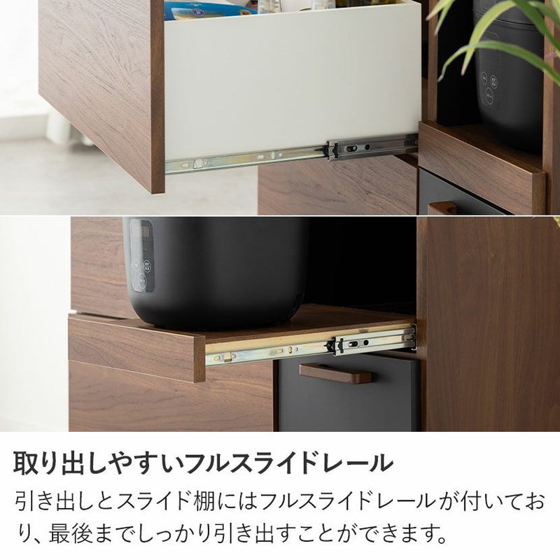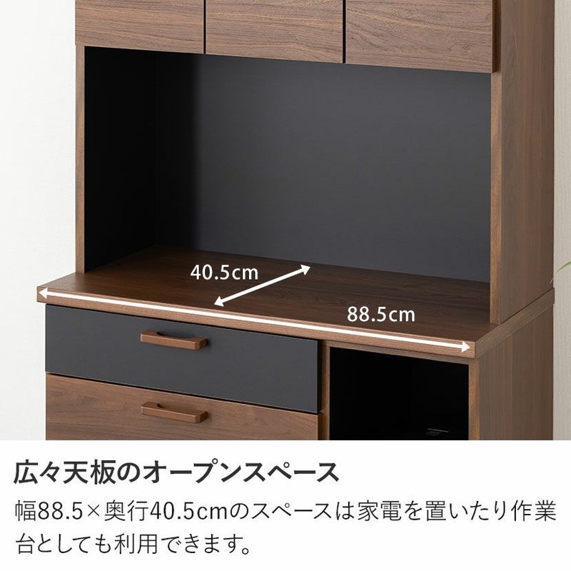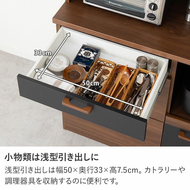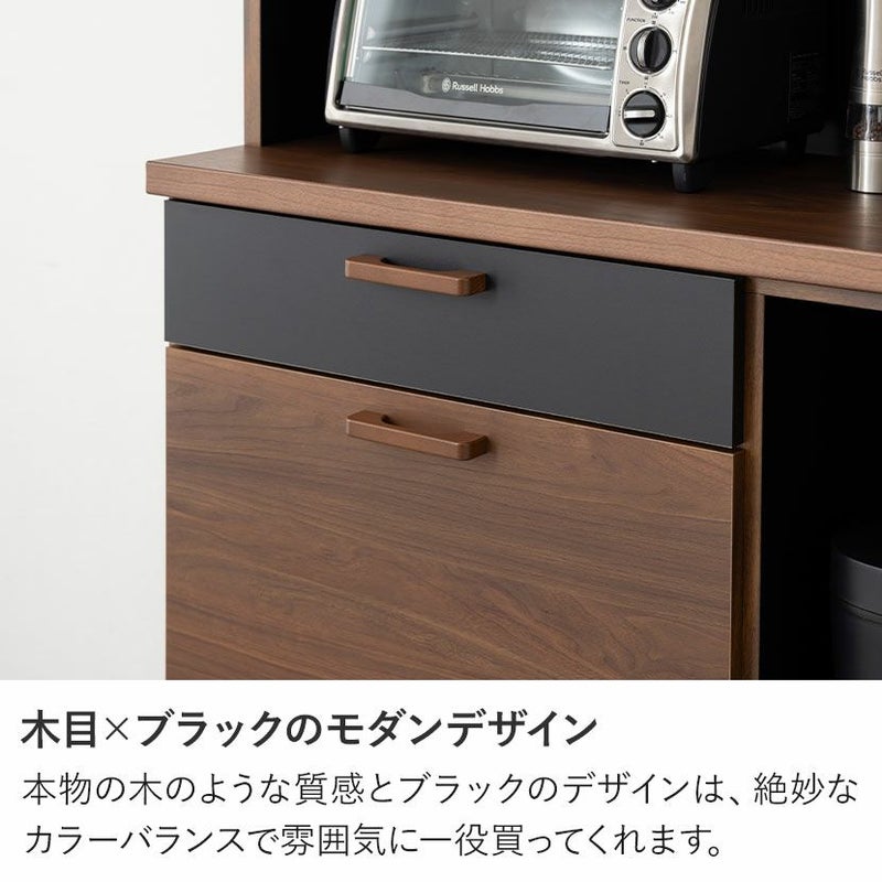 ●すぐに使える完成品取っ手や可動棚をセットするだけで、届いたその日にすぐにお使いいただけます。●シリーズで統一感も◎同シリーズのカウンターと並べて使用することも可能。高さがぴったりなのが嬉しいポイントです。●木目×ブラックのモダンデザイン本物の木のような質感とブラックのデザインは、絶妙なカラーバランスで雰囲気に一役買ってくれます。●無駄のない収納スペース扉収納は食器や雑貨に合わせて調節できる可動棚で、無駄のない収納ができます。●可動棚各扉に1枚ずつある可動棚は6cm間隔で3段階に調節いただけます。●広々天板のオープンスペース幅88.5×奥行40.5cmのスペースは家電を置いたり作業台としても利用できます。●便利なコード穴オープンスペースには便利なコード穴がついており、家電を置く場所を選びません。●キッチン小物をすっきり収納左側下部には小1つ、大2つの引き出しでカトラリー類、お鍋などもまとめて整頓することができます。●小物類は浅型引き出しに浅型引き出しは幅50×奥行33×高7.5cm。カトラリーや調理器具を収納するのに便利です。●大きな物は深型引き出しに下段2つの引き出しは幅50×奥行33.5×高16.5cm。大きな鍋やボトル、食品ストックの保存に便利です。●滑らかに引き出せるスライド棚必要な時だけ引き出して使える、便利なスライド棚が付いています。炊飯器にちょうどいいサイズ感です。●取り出しやすいフルスライドレール引き出しとスライド棚にはフルスライドレールが付いており、最後までしっかり引き出すことができます。●小さな物から大きな物もすっきり収納深型引き出しは幅21×奥行33.5×高16.5cm。パスタやペットボトルなど、背丈が高い物の収納に便利です。●開け閉めしやすい取っ手引き出しの取っ手はエッジ加工を施した、優しく滑らかな手触りです。●コの字型転倒防止金具上下の連結部分の安定性と転倒防止性をさらに高める金具が付属しています。