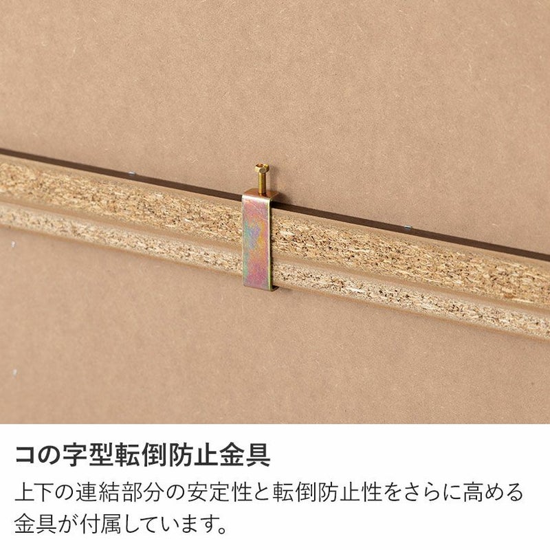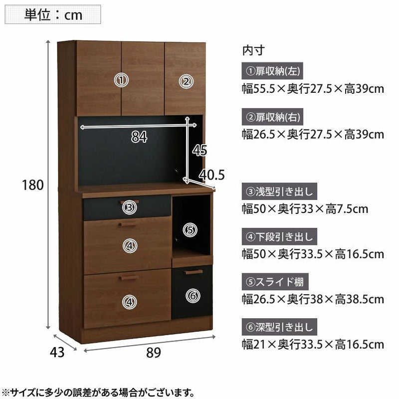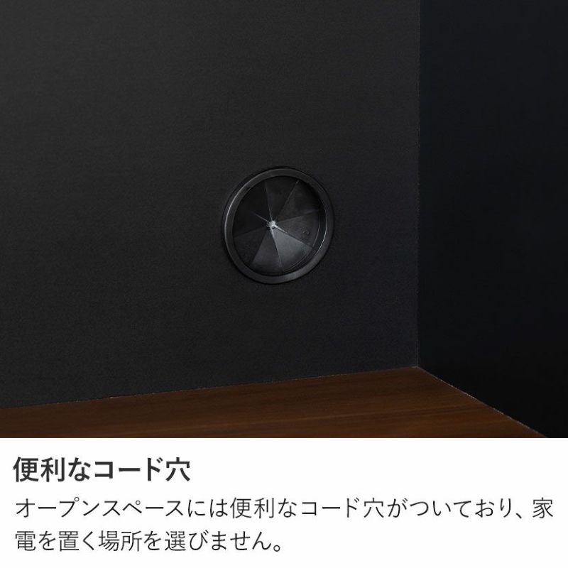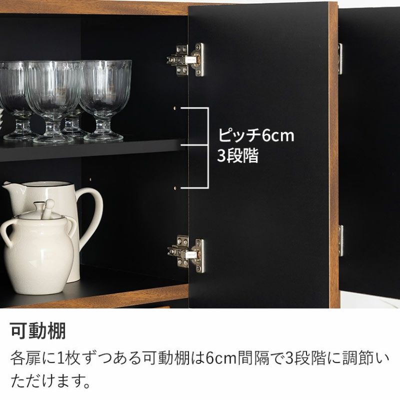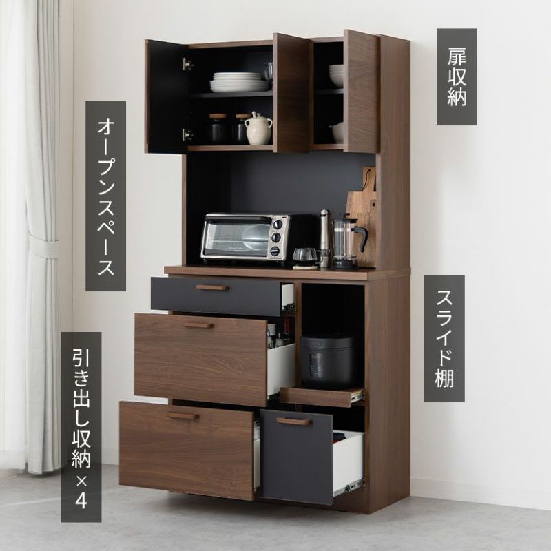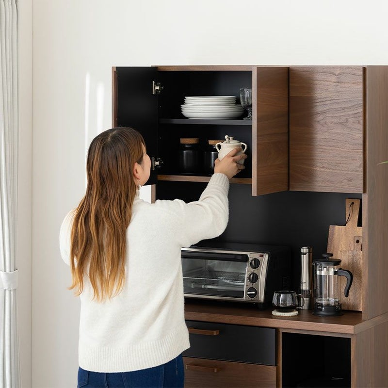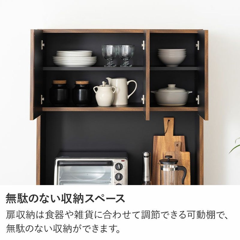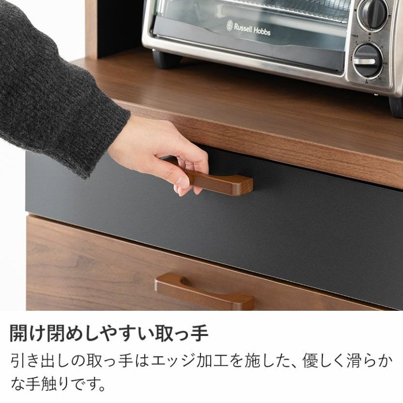 ●すぐに使える完成品取っ手や可動棚をセットするだけで、届いたその日にすぐにお使いいただけます。●シリーズで統一感も◎同シリーズのカウンターと並べて使用することも可能。高さがぴったりなのが嬉しいポイントです。●木目×ブラックのモダンデザイン本物の木のような質感とブラックのデザインは、絶妙なカラーバランスで雰囲気に一役買ってくれます。●無駄のない収納スペース扉収納は食器や雑貨に合わせて調節できる可動棚で、無駄のない収納ができます。●可動棚各扉に1枚ずつある可動棚は6cm間隔で3段階に調節いただけます。●広々天板のオープンスペース幅88.5×奥行40.5cmのスペースは家電を置いたり作業台としても利用できます。●便利なコード穴オープンスペースには便利なコード穴がついており、家電を置く場所を選びません。●キッチン小物をすっきり収納左側下部には小1つ、大2つの引き出しでカトラリー類、お鍋などもまとめて整頓することができます。●小物類は浅型引き出しに浅型引き出しは幅50×奥行33×高7.5cm。カトラリーや調理器具を収納するのに便利です。●大きな物は深型引き出しに下段2つの引き出しは幅50×奥行33.5×高16.5cm。大きな鍋やボトル、食品ストックの保存に便利です。●滑らかに引き出せるスライド棚必要な時だけ引き出して使える、便利なスライド棚が付いています。炊飯器にちょうどいいサイズ感です。●取り出しやすいフルスライドレール引き出しとスライド棚にはフルスライドレールが付いており、最後までしっかり引き出すことができます。●小さな物から大きな物もすっきり収納深型引き出しは幅21×奥行33.5×高16.5cm。パスタやペットボトルなど、背丈が高い物の収納に便利です。●開け閉めしやすい取っ手引き出しの取っ手はエッジ加工を施した、優しく滑らかな手触りです。●コの字型転倒防止金具上下の連結部分の安定性と転倒防止性をさらに高める金具が付属しています。