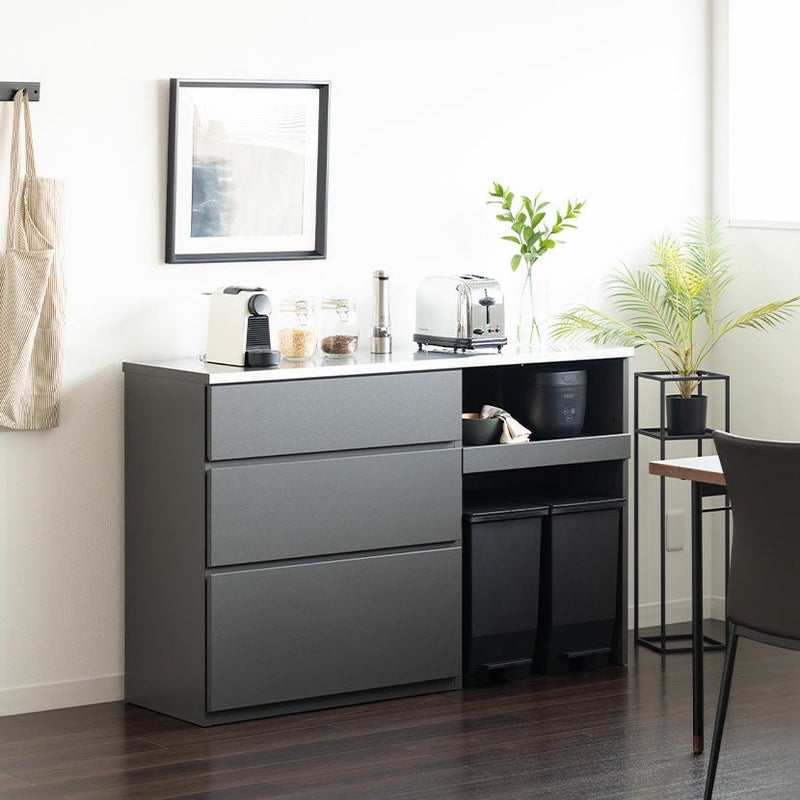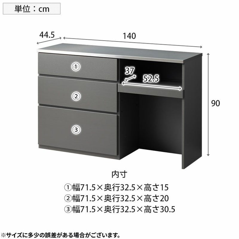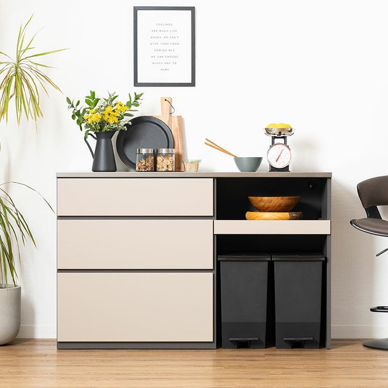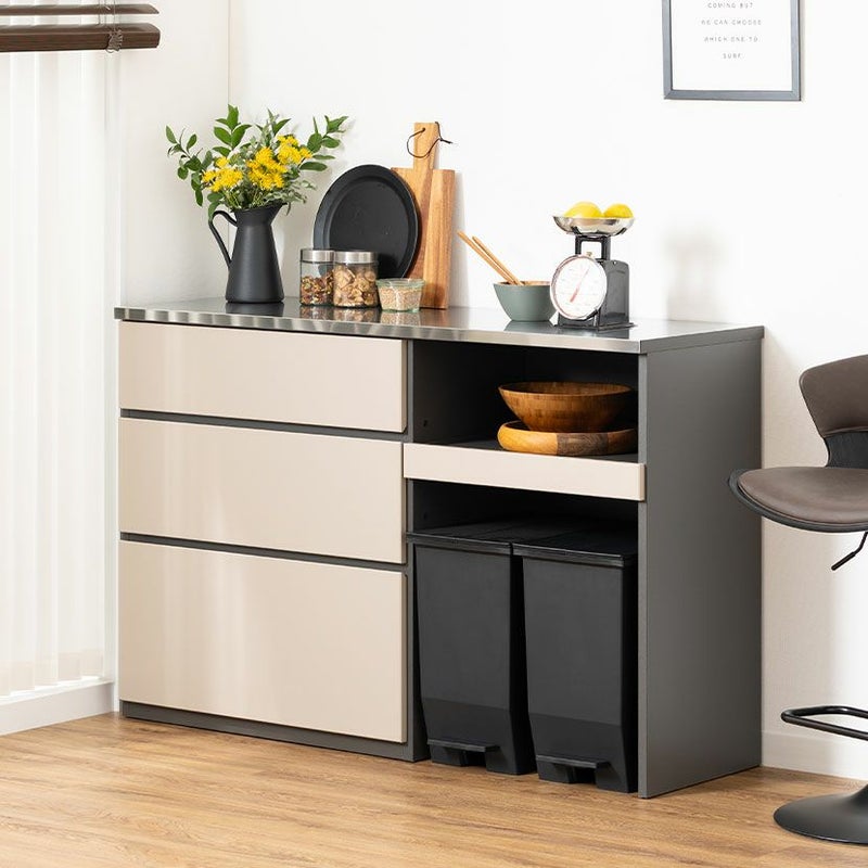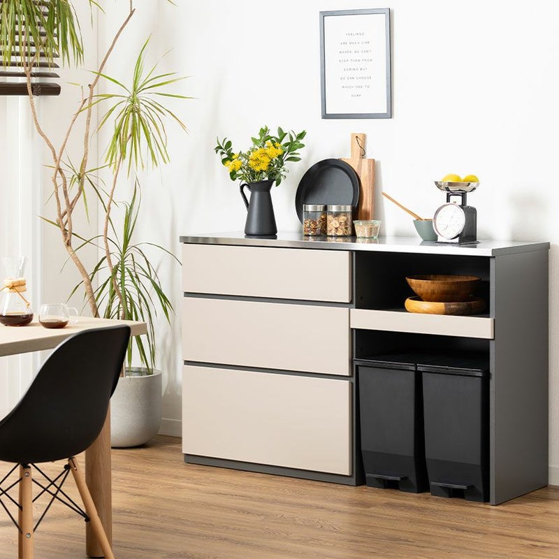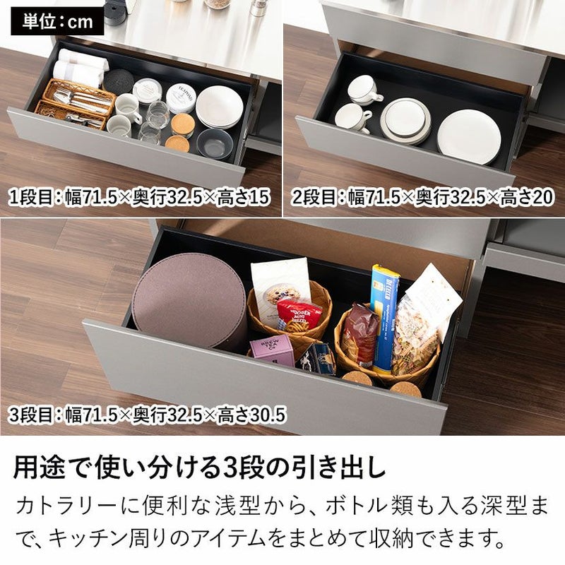 カトラリーなどの小物整理に便利な浅型から、保存食や高さのある調味料ボトルも収納しやすい深型の引き出しまで、用途に合わせて使い分けられる3段構成です。